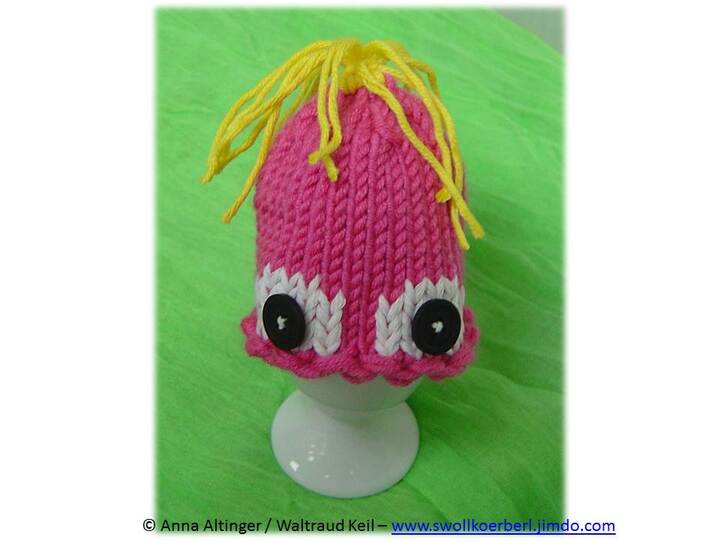 Empfehlung: Augen in schwarz einsticken, wenn die Eierwärmer für Babys/Kleinkinder als Amigurumi verwendet werden.