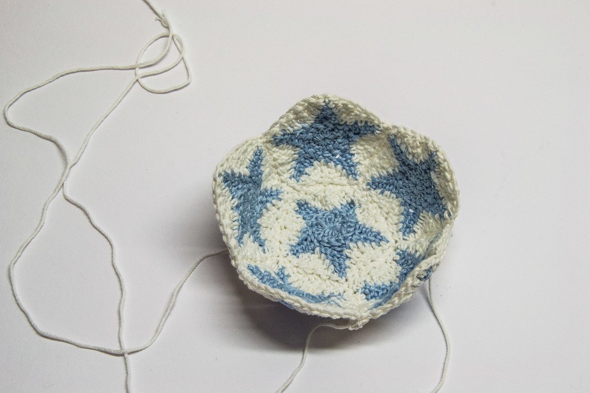 Mit romantischen Sternen geschmückt. Durchmesser ca. 12 cm. Mit Häkelnadel Nr. 3,5 gearbeitet.