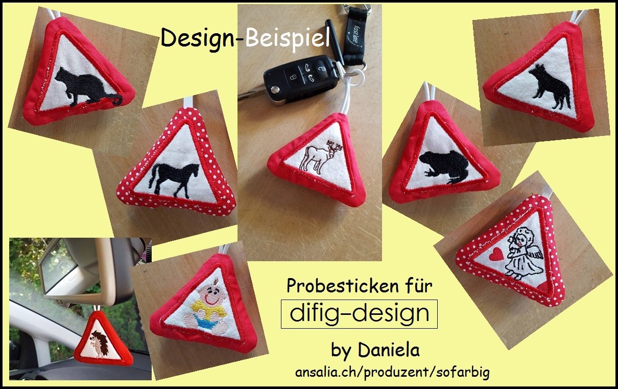 Was schenkt man einem Autofreak oder einem Frosch-Schützer? Was einer Mama oder einem Elch-Fan? Oder was könnte man einem Katze-oder Hundebesitzer mitbringen? Sie suchen ein Geschenk für einen Pferdenarr oder eine Igel-Mama? Diese ITH-Stickdateien in Form von Vorsicht-Schilder sind für besondere Menschen gedacht, für besondere Momente. Im handumdrehen sticken Sie nach Anleitung einen tollen Rückspiegel-Baumler für das Auto oder einen Schlüsselanhänger. Mit den Motiven Baby, Elch, Igel, Schutzengel, Hund, Katze, Frosch oder Pferd wird man immer fündig. Und das Beste ist dass ich zu den Dateien auch eine Blankodatei packe. So steht der eigenen Fantasie nichts mehr im Weg.
