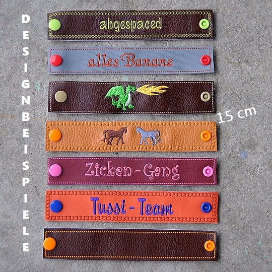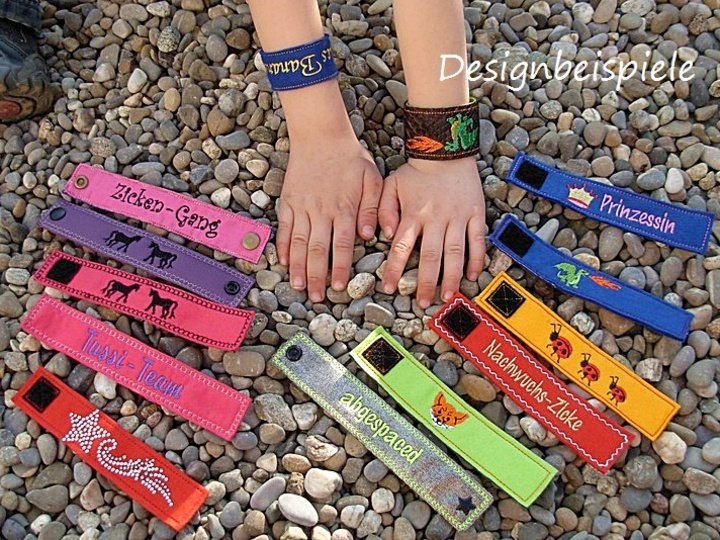 Egal ob Sie die Armbänder auf Kunstleder oder Filz sticken, beides geht. Und die kleineren Bänder gibt es sogar in Klett oder Snap-Art. Insgesamt umfasst die ITH-Stickdatei 23 Motive. Und wenn Mami mehrere Armbänder anfertigen möchte, so habe ich für die Klettform Rückseiten im 3er Pack beigelegt für den 13x18 Rahmen.