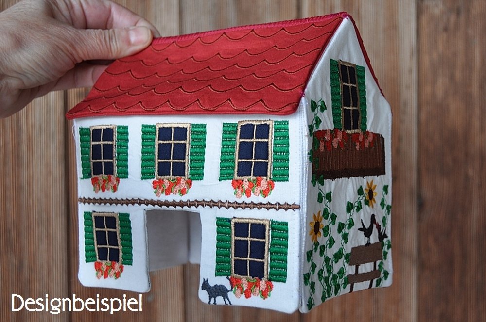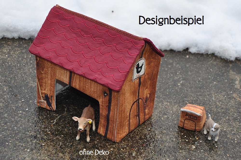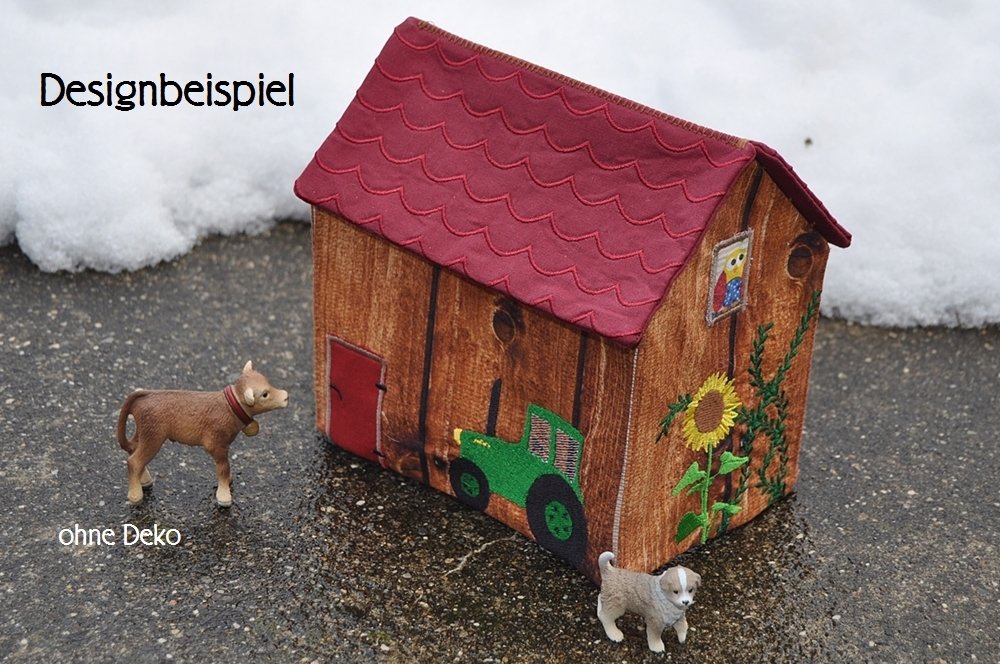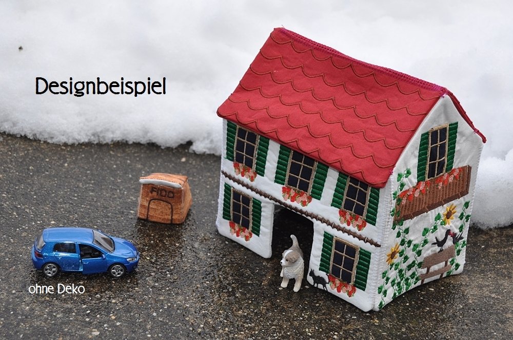 Geliefert werden 4 Dateien für das Bauernhaus, 4 Dateien für die Scheune und zwei Dachmöglichkeiten. Ausserdem 1 Datei für das Hundehaus. Alle Dateien für den 13 x 18 Rahmen. Die fertigen Häuser haben eine Endgrösse von ca. 15 x 15 cm, die Höhe 15 cm. Das Hundehaus wird am Stück gestickt und ist mit 3,5 x 3,5 cm Bodenfläche schön klein.