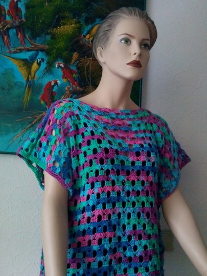 Der Poncho - Pulli wird in Reihen gehäkelt.