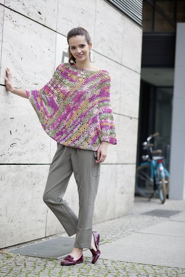 Material: 500 g Pink/Oliv/Senf (Farbe 04) „Woolly Hugs BANDY“ (100% Baumwolle, Lauflänge = 210 m/100 g) von LANGENDORF & KELLER. KNITPRO-Häkelnadel Nr. 6.