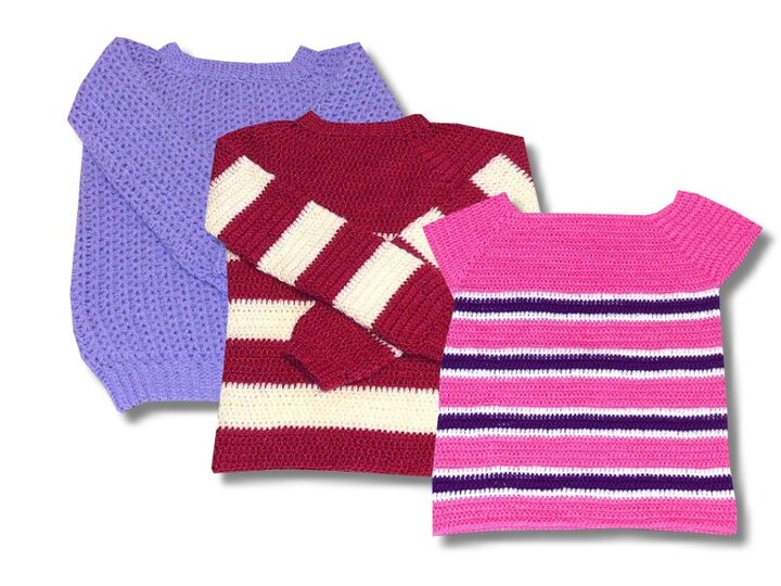 Die Pullover werden alle vom Halsausschnitt abwärts gehäkelt (RvO). Sie werden dem Kinderkörper entsprechend gehäkelt und passen garantiert immer.