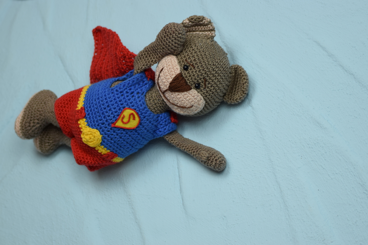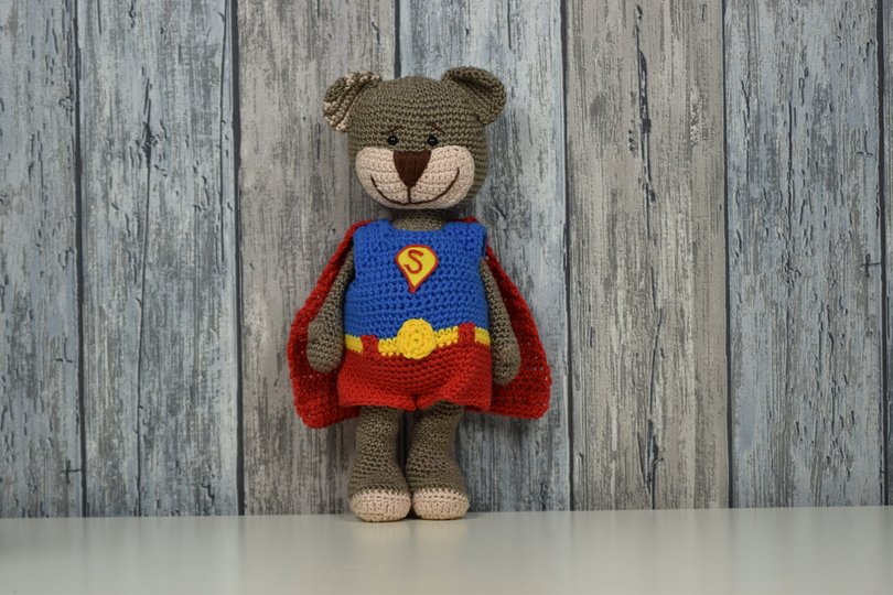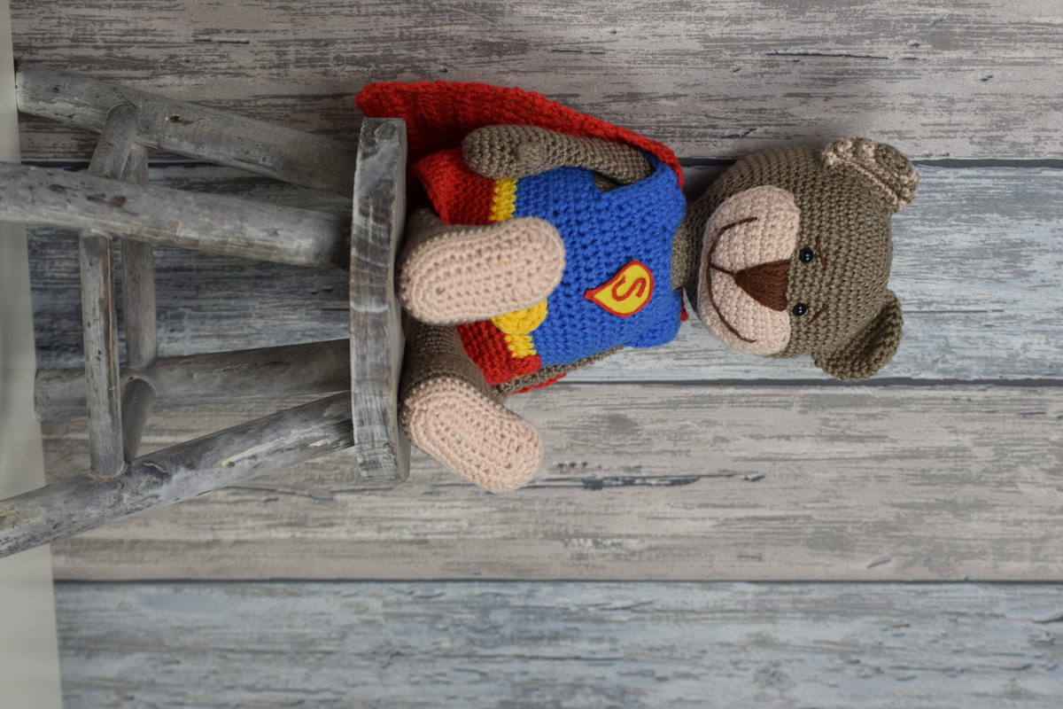 Bruno wird mit Baumwollgarn ( LL125/50g) und einer Häkelnadel 2.5 ca.30 cm groß.