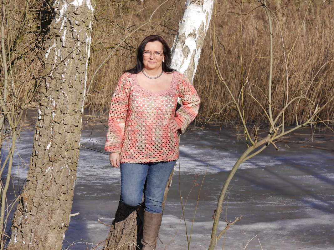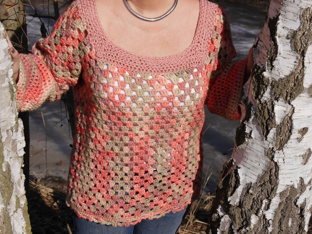 Ein Pulli mit einem luftigen Häkelmuster wie geschaffen für den Frühling .Die unterschiedlichen Muster ergänzen sich und bilden durch das Verlaufsgarn eine harmonische Einheit .