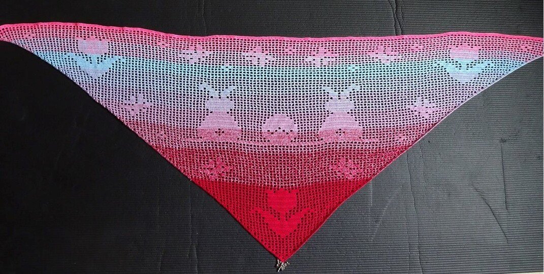 Das Tuch wurde mit Nadelstärke 3 und einem Bobble ca. 800 Meter LL und 3 fädrig gehäkelt. Es ist ca. 200 cm lang (linke zur rechte Ecke) und ca. 75 cm breit (Mitte bis zur Spitze) – die Größe ist aber abhängig von der Nadelstärke, der Festigkeit der einzelnen Maschen und dem verwendeten Garn.