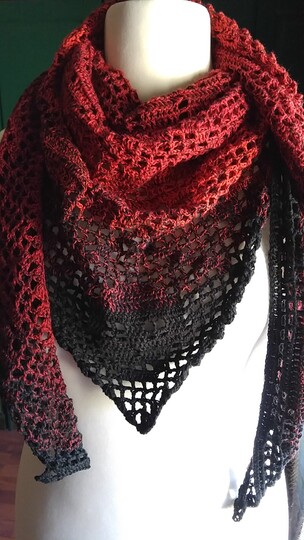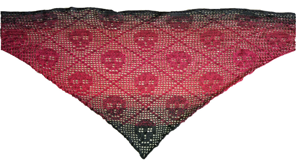 Einfach zu häkelndes Dreiecktuch mit Totenkopfmotiven in Filethäkeltechnik. Das Muster ist leicht zu merken und daher auch für Anfänger geeignet. Das Mustertuch wurde mit einem vierfädigen Farbverlaufsgarn gehäkelt. Verwendet wurden ca. 200g/760Meter. Damit hat das Tuch eine Größe von etwa 200x70 cm. Ganz leicht kannst du die Größe deines persönlichen Tuches selbst verändern.