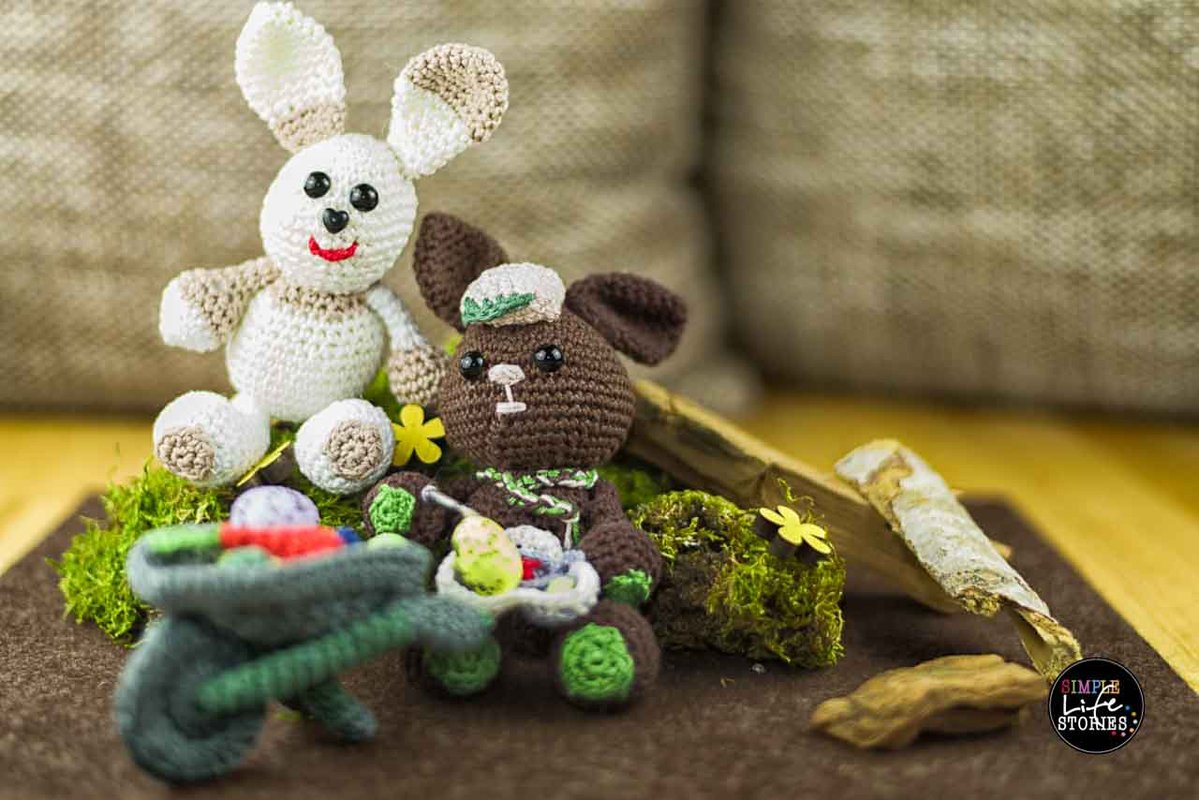Ostern kann kommen, die kleinen Helfer sind schon sehr fleißig und haben auch schon viele Eier angemalt und in die Schubkarre gelegt. Die Hasen sind schnell gehäkelt. Sie sind völlig identisch gearbeitet, ich habe nur verschiedene Farben benutzt. Der kleine Stups hat noch eine lässige Kappe auf und Hoppel hat eine Möhre, die er zur Belohnung für seine Hilfe beim Eierbemalen bekommen hat.