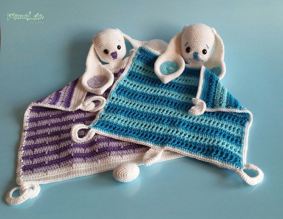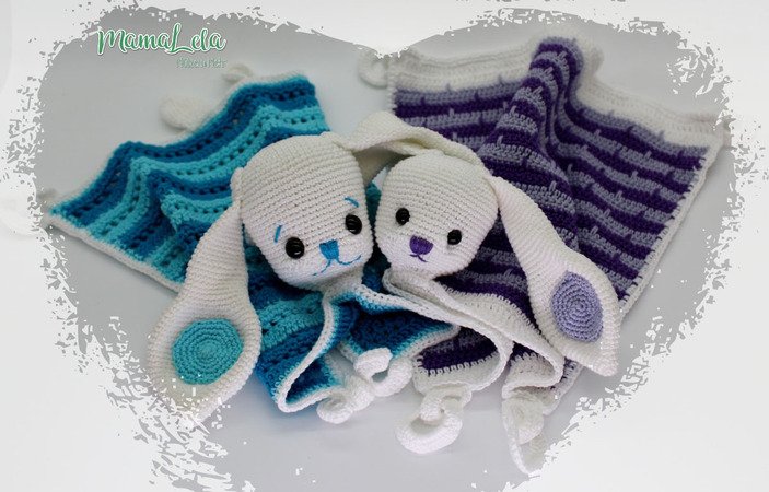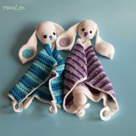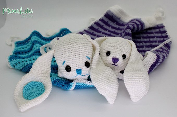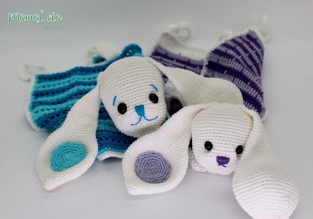Diese bestechen nicht nur durch das Muster des gehäkelten Tuches, sondern auch durch die angehäkelten Details. Ihre großen Ohren animieren zum Greifen und so liegt das Schnuffeltuch immer fest in der Hand.