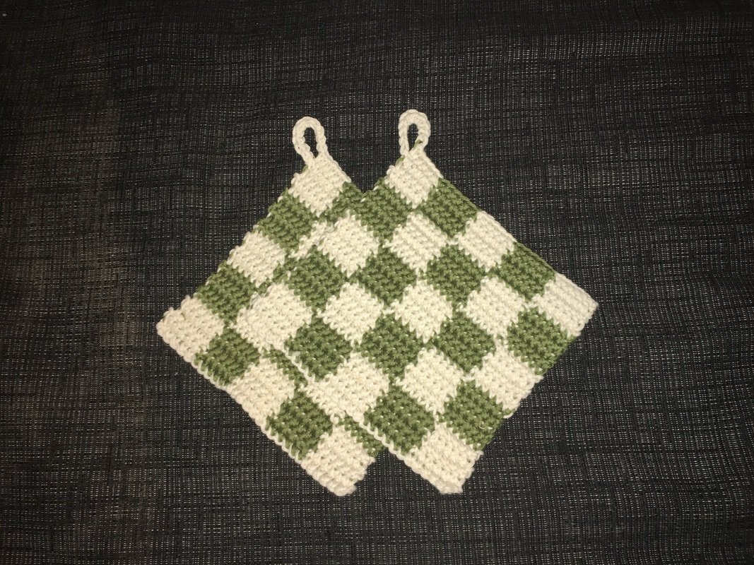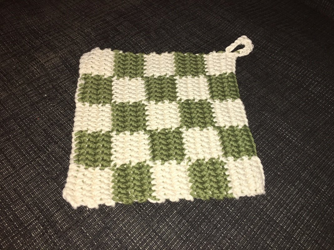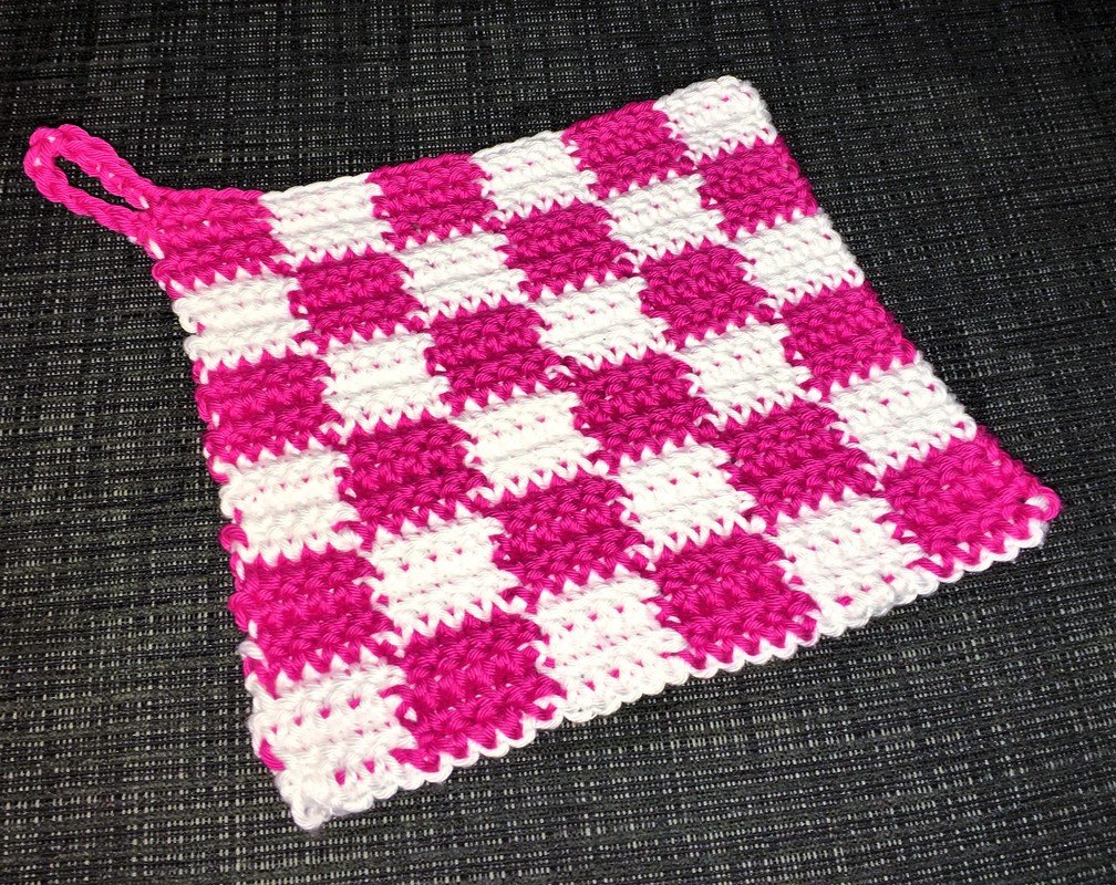 Mit dieser Häkelanleitung kannst du dir schicke und moderne Topflappen im Schachbrettmuster anfertigen. Gehäkelt wird mit der tapestry-Methode, bei der das Garn nach dem Farbwechsel umhäkelt wird.