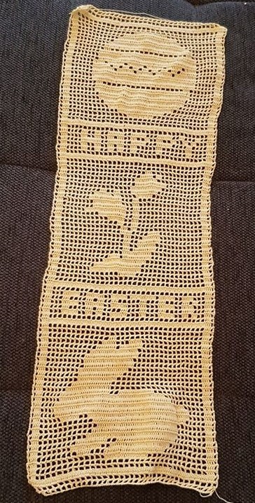 Ich habe mit NS 1,25 gearbeitet und einfarbigem Baumwoll - Filet- Garn. Das Deckchen ist im ungespanntem Zustand 70 cm lang.