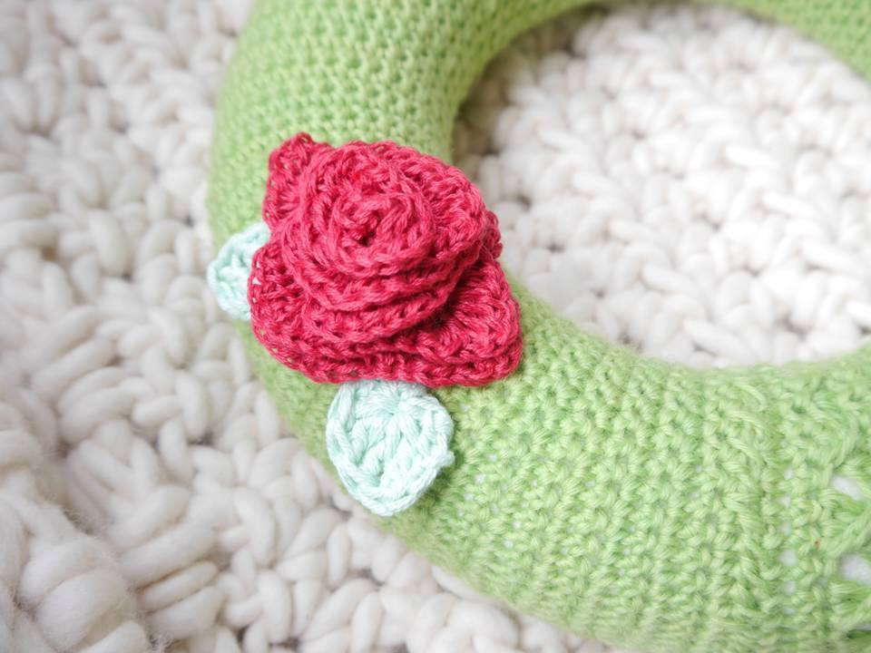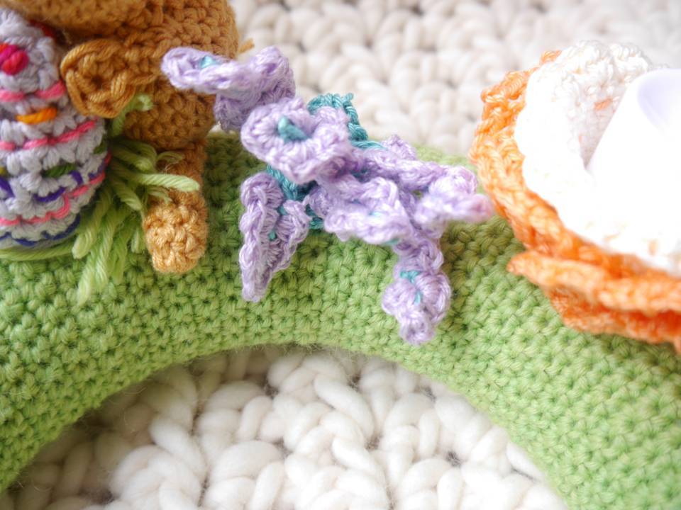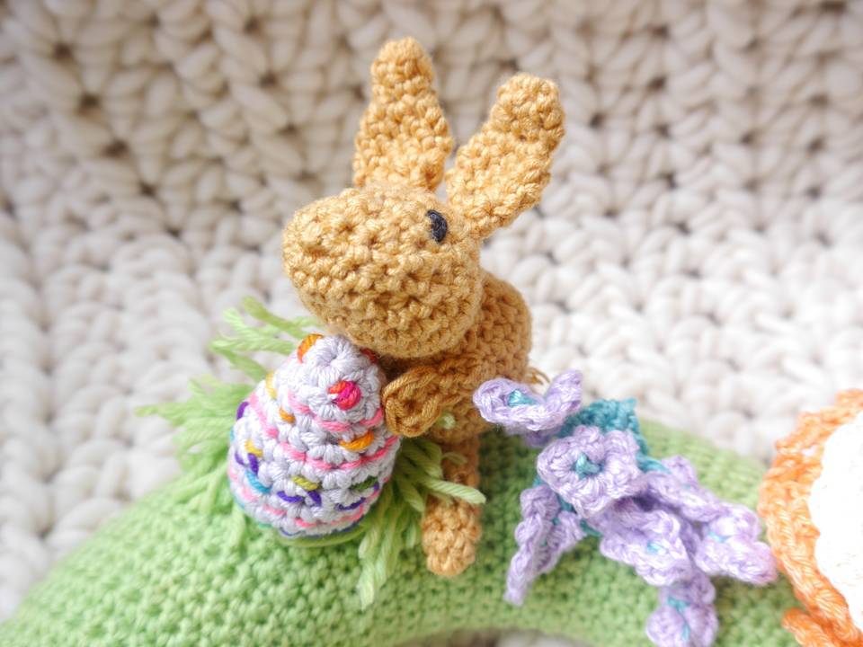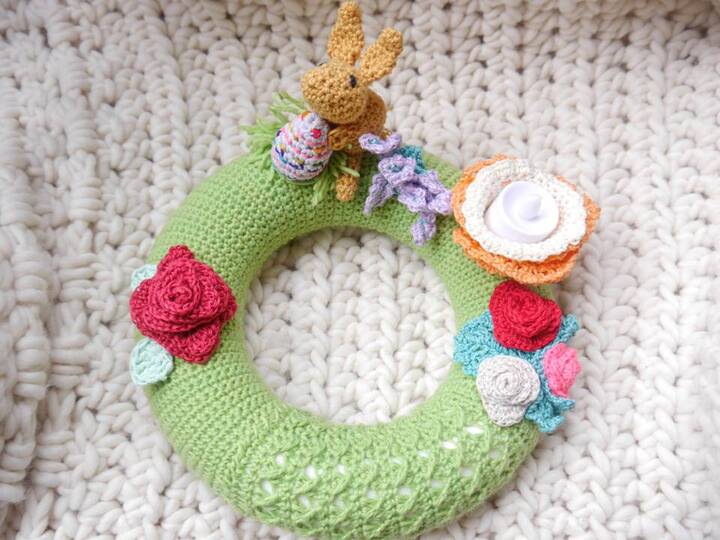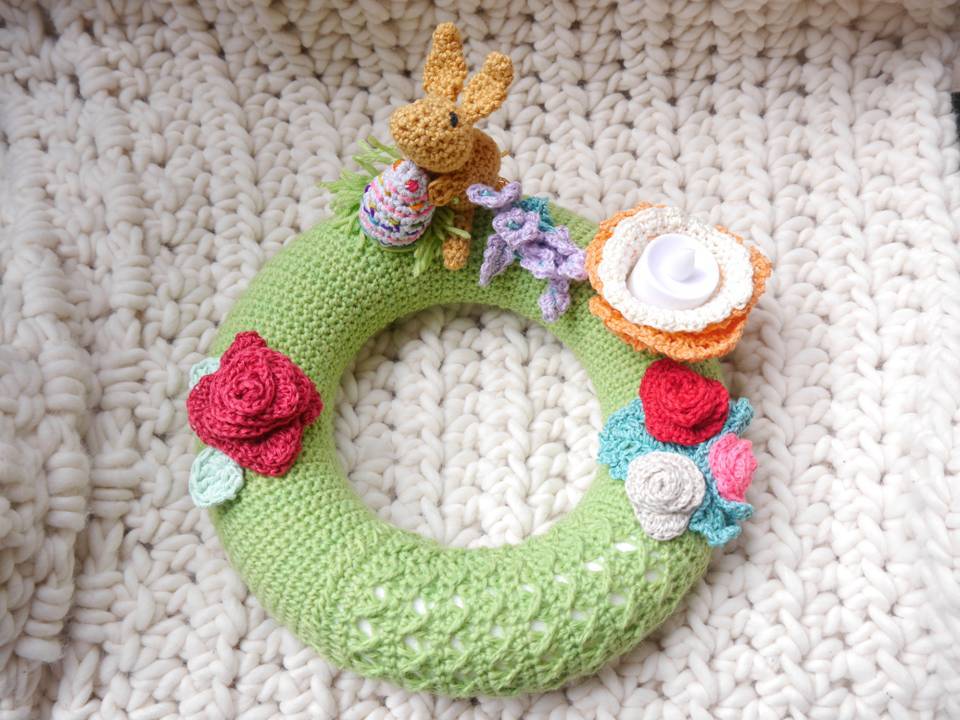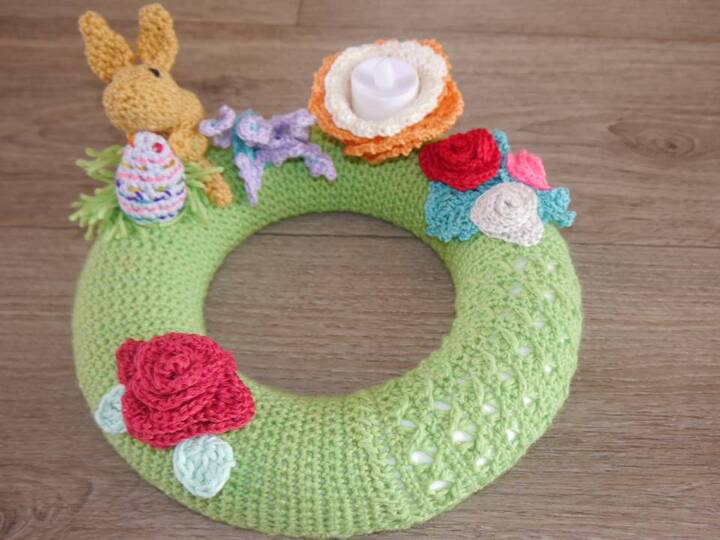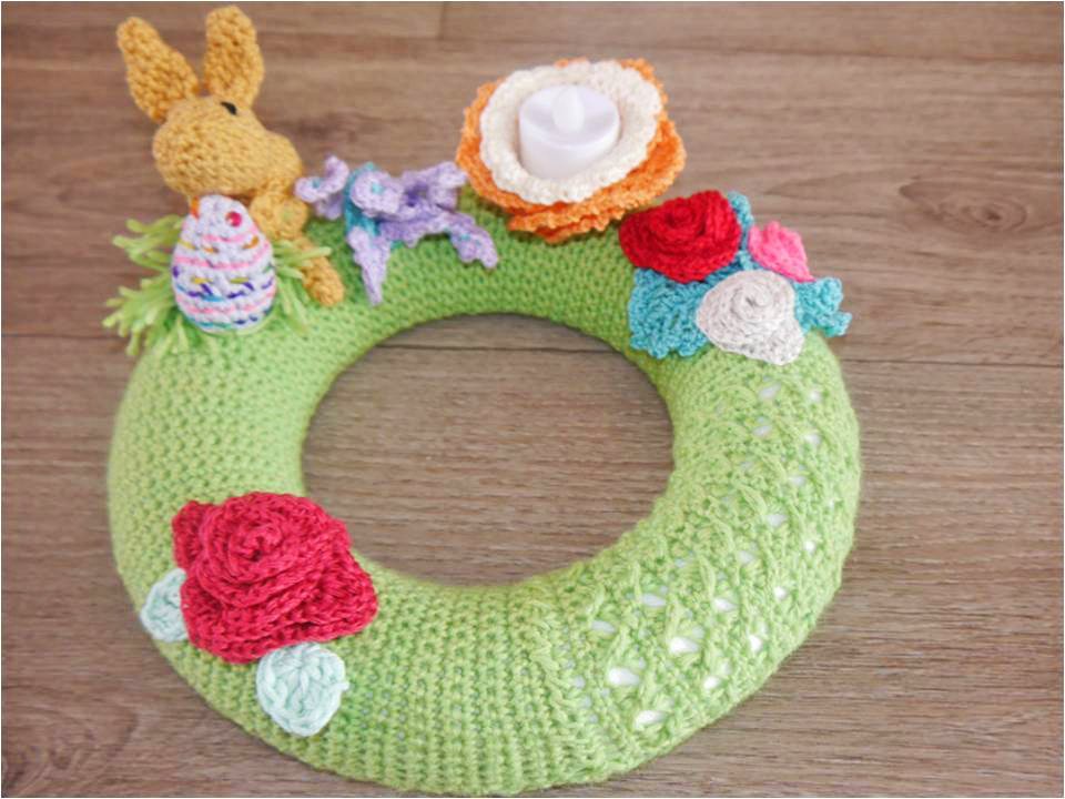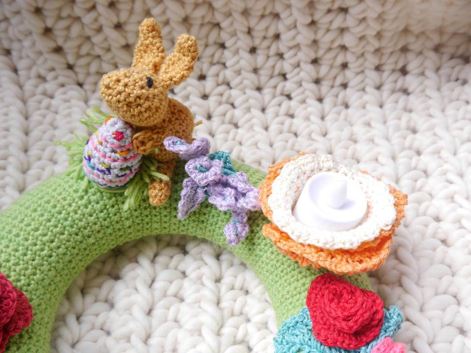 Aus Wollresten ein süßes Osterhäschen mit Blumen häkeln und zu einem Tischkranz kombinieren.