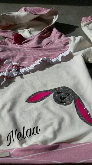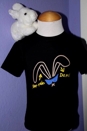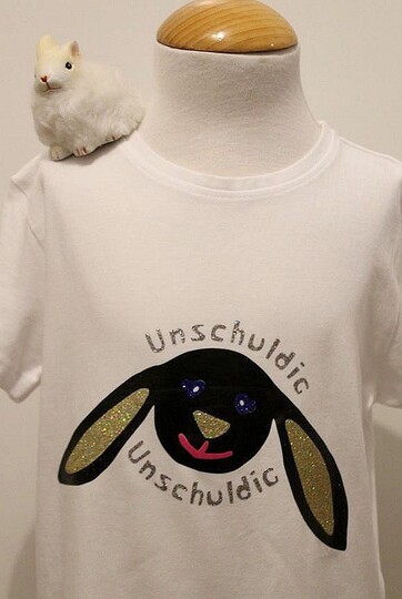 ☆ Hasenkopf mit Schlappohren mit Schriftzug: Unschuldig (oben gebogen unten gebogen)