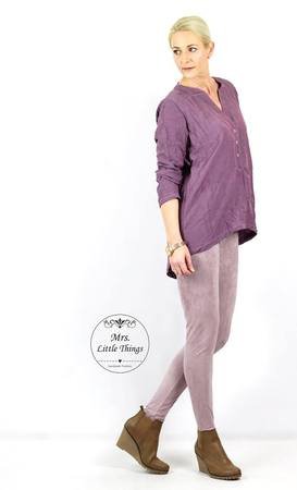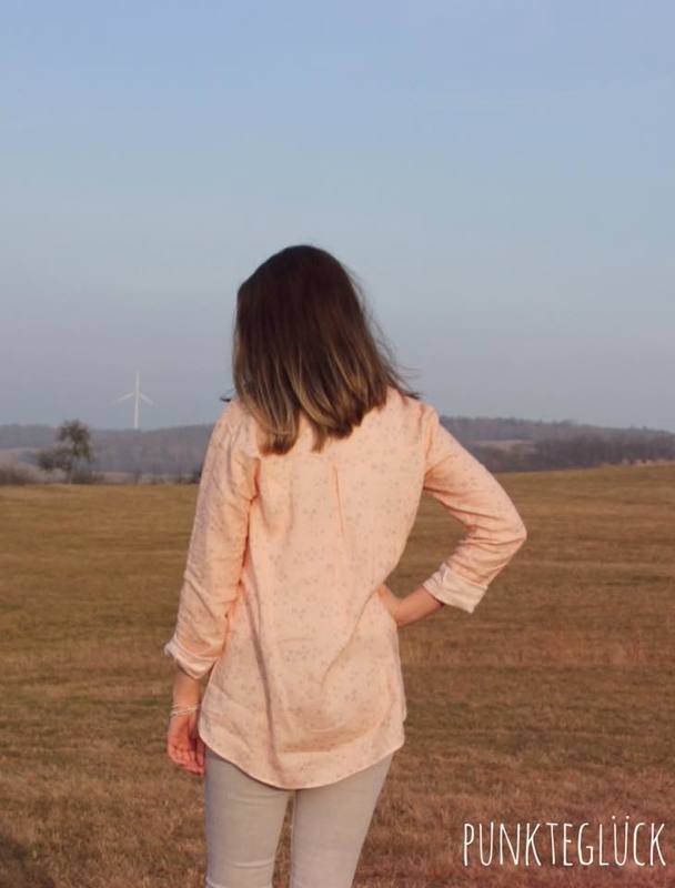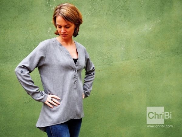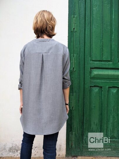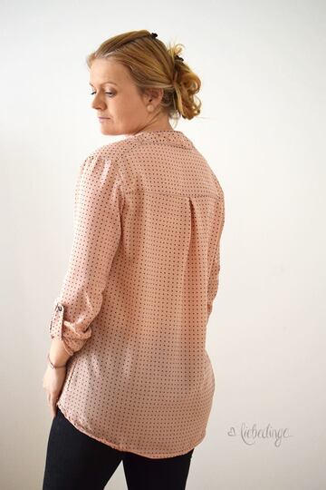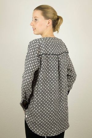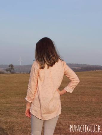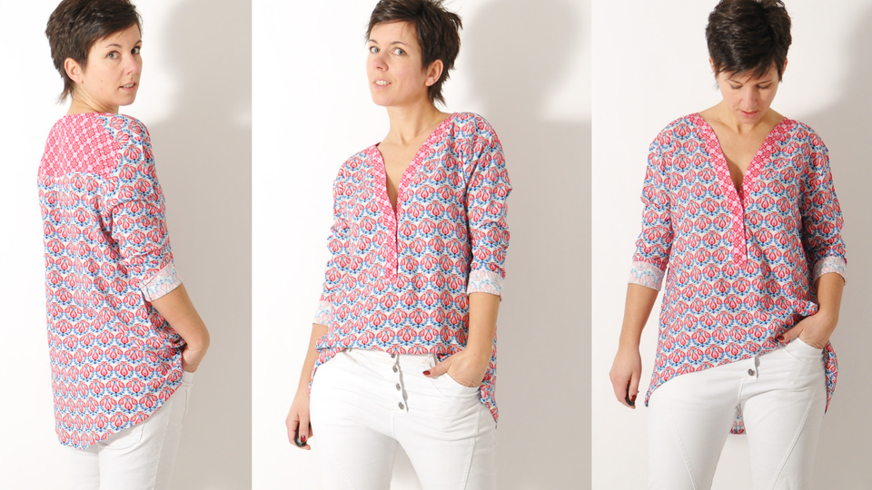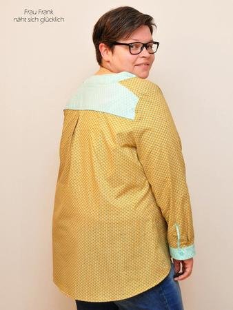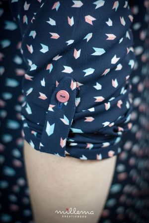 Die angesetzte Knopfleiste geht bis zum Bauch und setzt mit bunten Knöpfen einen Akzent. Die Schulternähte sind etwas nach hinten versetzt und die Schulterpasse kann mit einer Paspel abgesetzt werden. Die Armabschlüsse können entweder mit einem Tunnel und Gummiband gearbeitet werden, oder einfach gesäumt werden und zusätzlich nach oben gekrempelt werden und mittels 2 Riegeln an Ort und Stelle gehalten werden. Eine klassische Manschettenverarbeitung ist außerdem auch vorgesehen.