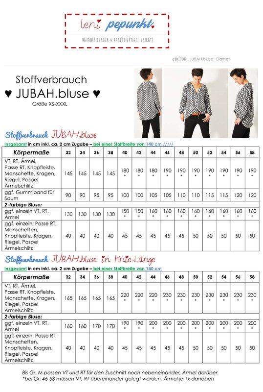 Das eBOOK enthält die Schnitte für die Einzelgrößen 32-58, sowie Fotos zu jedem Arbeitsschritt – hier sind auch Nähanfängerinnen bestens mit beraten!