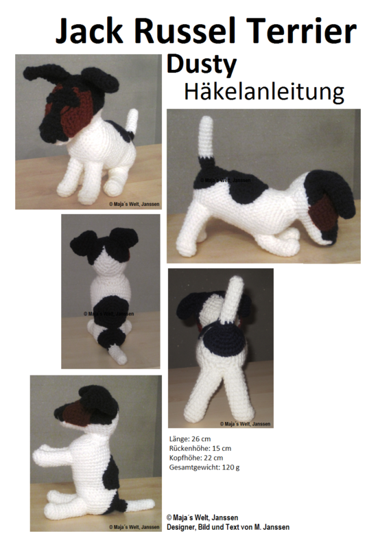 Sie ist nach der Fertigstellung im Gesamtgewicht 120g, hat eine Länge von 26 cm, die Rückenhöhe beträgt 15 cm und die Kopfhöhe 22 cm. Das ist die Größe eines Welpen (Jack Russel) von ca. 12 Wochen.
