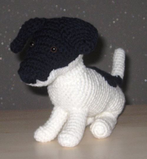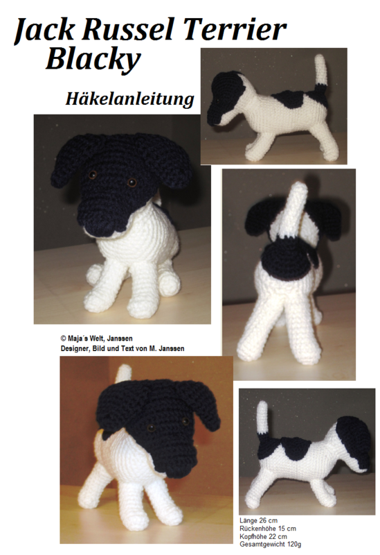 Sie ist nach der Fertigstellung im Gesamtgewicht 120g, hat eine Länge von 26 cm, die Rückenhöhe beträgt 15 cm und die Kopfhöhe 22 cm. Das ist die Größe eines Welpen (Jack Russel) von ca. 12 Wochen.