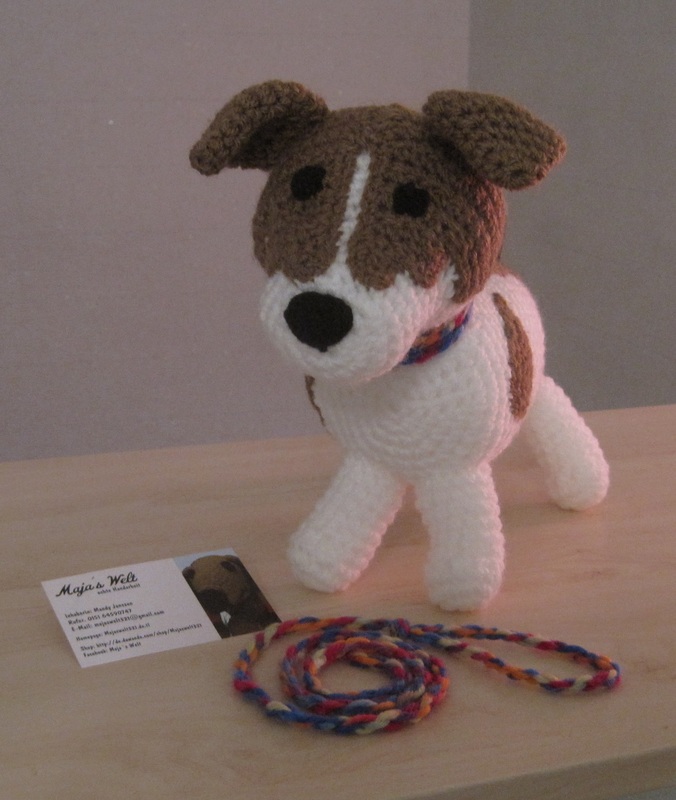 Sie ist nach der Fertigstellung im Gesamtgewicht 120g, hat eine Länge von 26 cm, die Rückenhöhe beträgt 15 cm und die Kopfhöhe 22 cm. Das ist die Größe eines Welpen (Jack Russel) von ca. 12 Wochen.