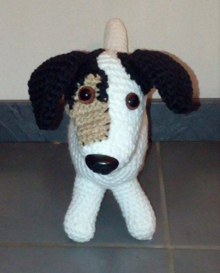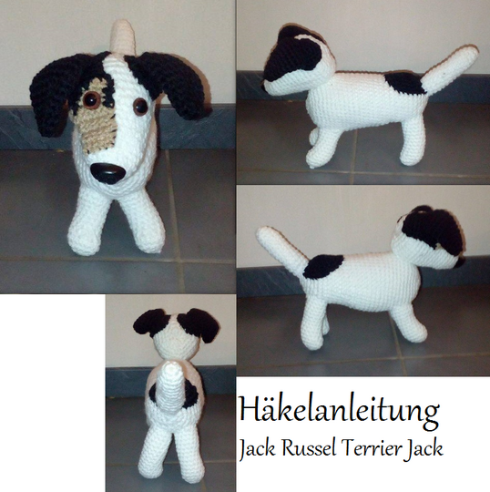 Sie ist nach der Fertigstellung im Gesamtgewicht 120g, hat eine Länge von 26 cm, die Rückenhöhe beträgt 15 cm und die Kopfhöhe 22 cm. Das ist die Größe eines Welpen (Jack Russel) von ca. 12 Wochen.