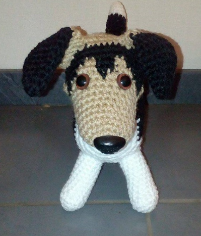 Sie ist nach der Fertigstellung im Gesamtgewicht 120g, hat eine Länge von 26 cm, die Rückenhöhe beträgt 15 cm und die Kopfhöhe 22 cm. Das ist die Größe eines Welpen (Jack Russel) von ca. 12 Wochen.