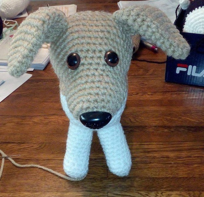 Sie ist nach der Fertigstellung im Gesamtgewicht 120g, hat eine Länge von 26 cm, die Rückenhöhe beträgt 15 cm und die Kopfhöhe 22 cm. Das ist die Größe eines Welpen (Jack Russel) von ca. 12 Wochen.