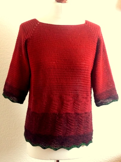 Der Pullover wird in Runden von oben nach unten gehäkelt.