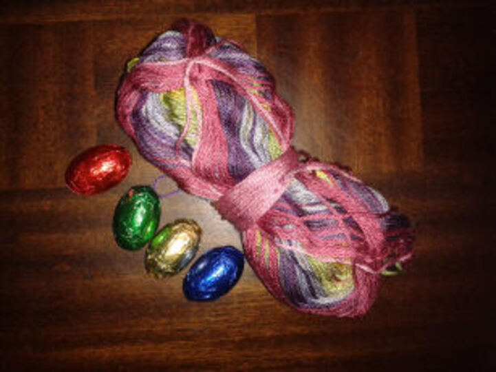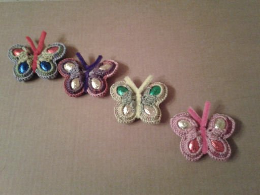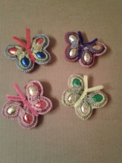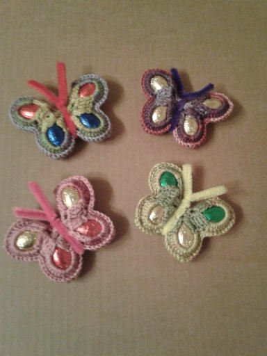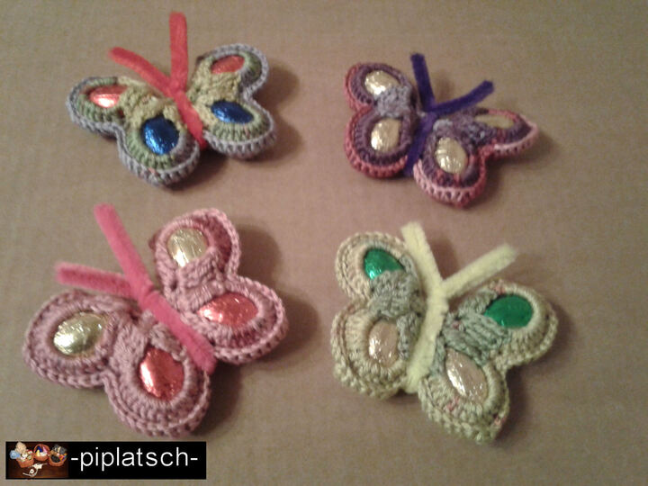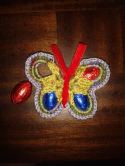 Der bunte gehäkelte Schmetterling wird mit 4 Schokoladeneiern gefüllt und mit Basteldraht verziert.