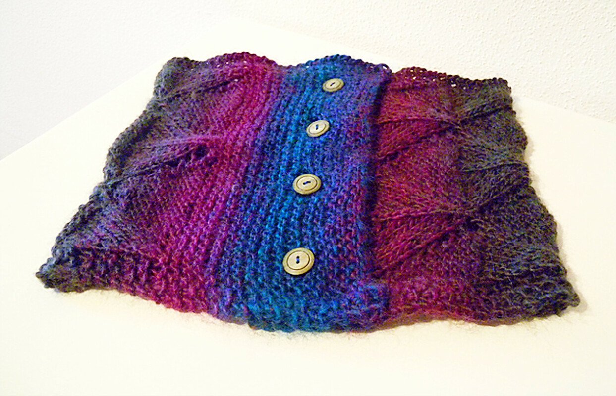 Der Loop wird in Reihen in einem einfachen Lochmuster gestrickt. Es gibt zwei Versionen; eine wird an den Enden zusammengenäht, die andere wird mit Knöpfen verbunden. Deshalb braucht man dafür Knopflöcher und schöne Knöpfe!