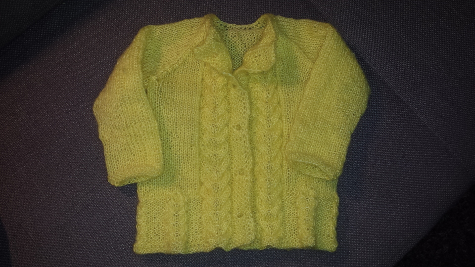 Raglan-Ärmel und Zopfmuster. Durch das dünne Mohairgarn wenig