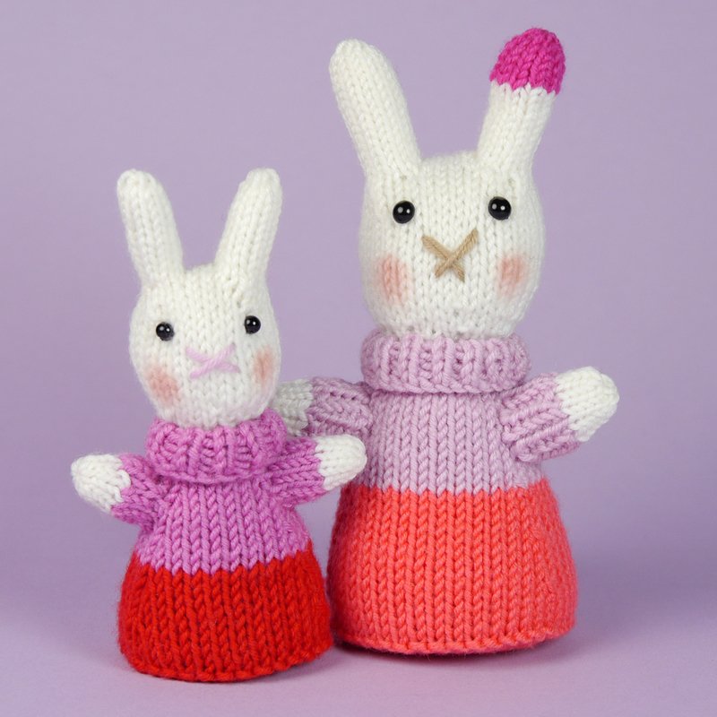 Mit diesen Häschen in zwei Größen wird Ihr Ostertisch noch bunter und fröhlicher! Sie sind so fix gestrickt, dass in Nullkommanix eine ganze Großfamile bei Ihnen herumhoppelt. Als kleine Geschenke bezaubern die Mini-Hasen Ihre Familie und Freunde – also nichts wie ran an die Wollrestekiste!
