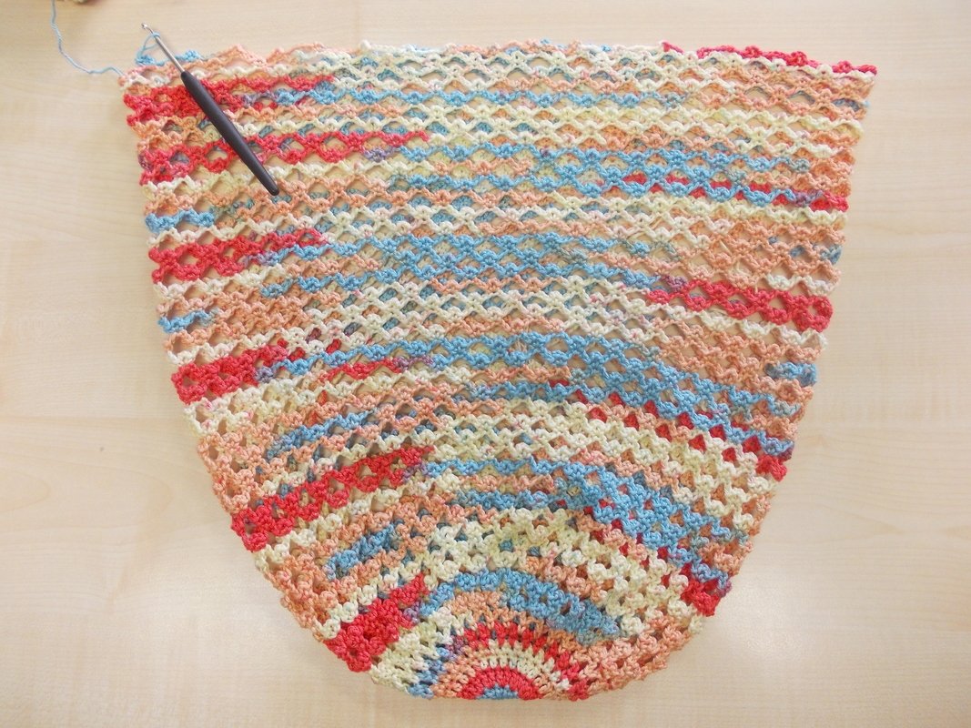 Es werden ca. 130 g reine Baumwolle von 120 m auf 50 g und eine Häkelnadel Nr. 3,5 benötigt. Das Muster ist leicht zu merken und geht fast von allein. Sie arbeiten Luftmaschen, feste Maschen und Stäbchen.