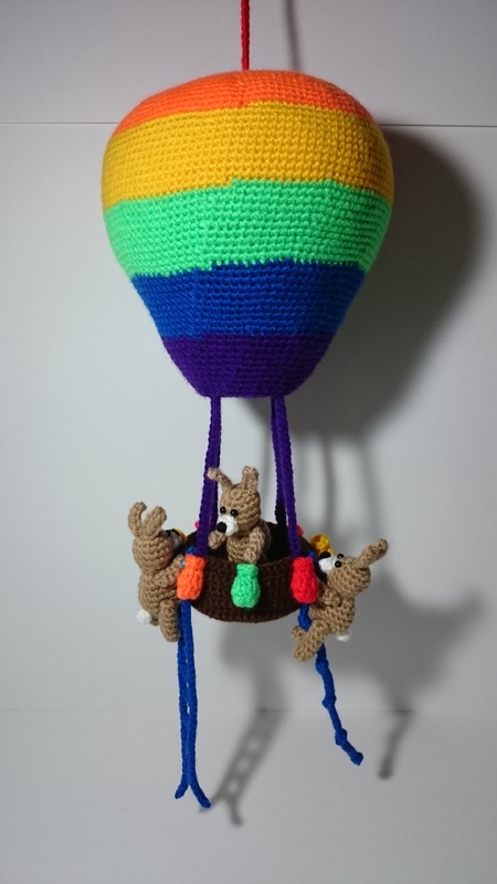 Wenn Du diese Wolle verwendest, wird der Ballon mit Korb und Leiter/ Seil ca. 35 cm hoch! Und die Häschen werden ca. 8 cm groß.