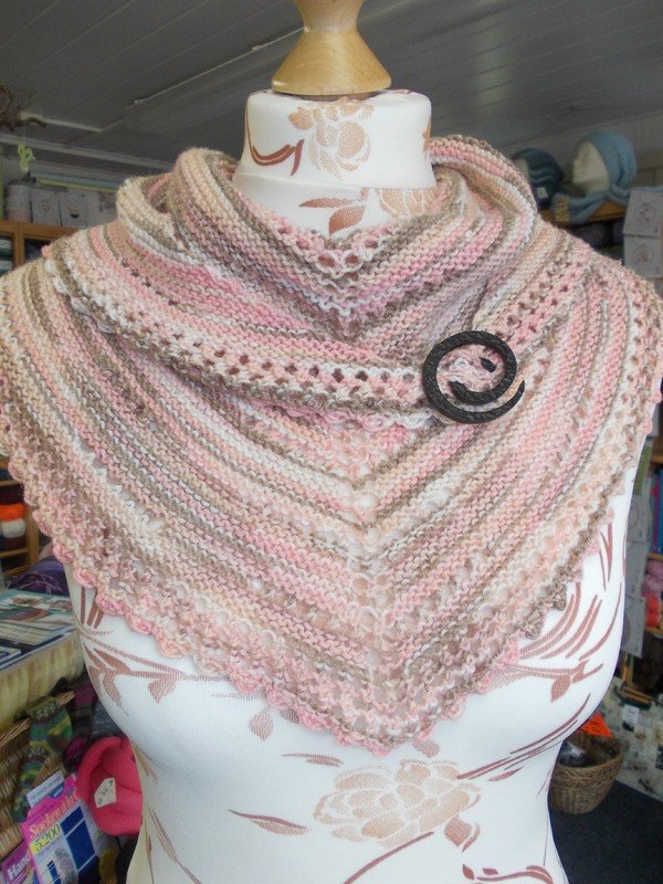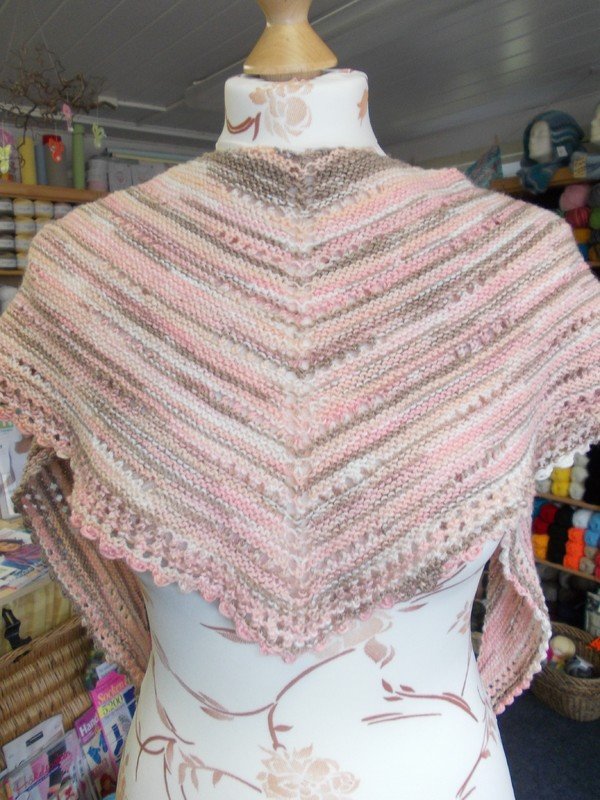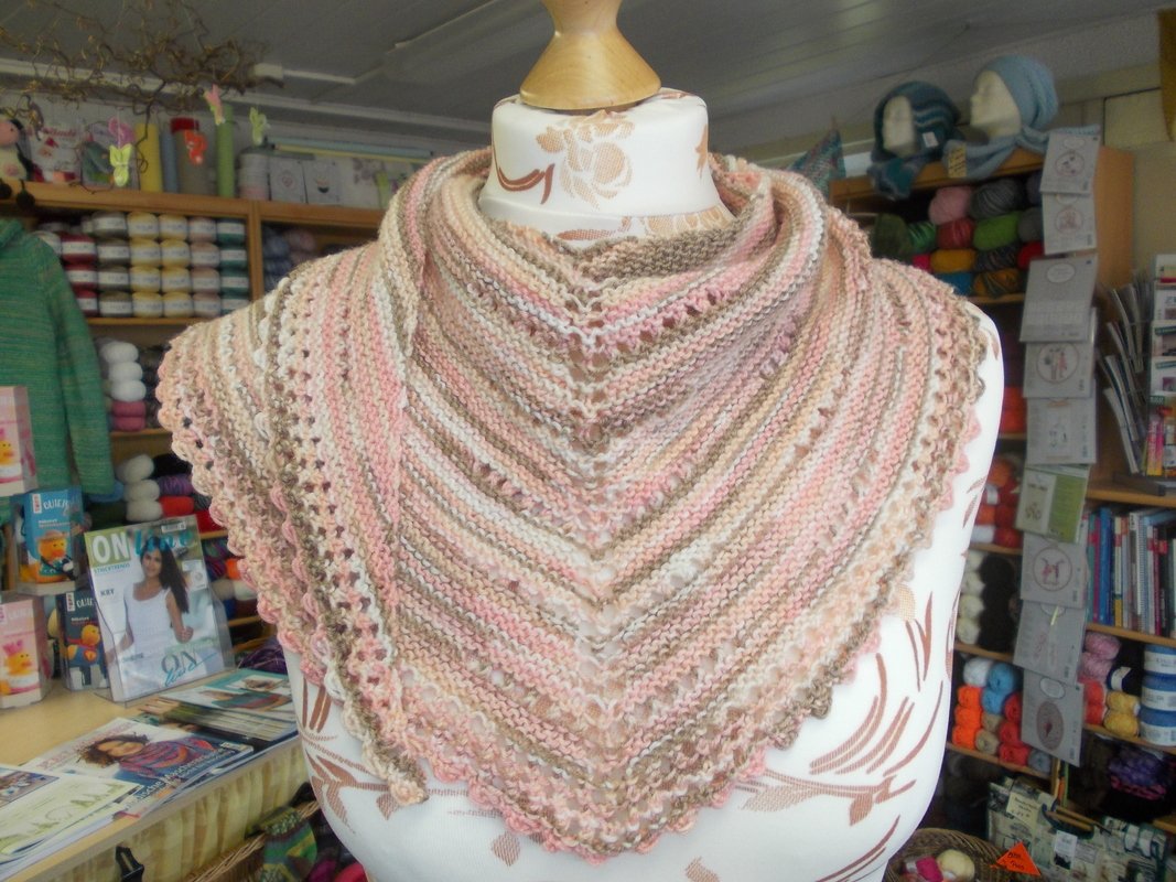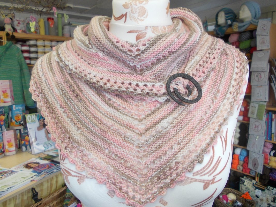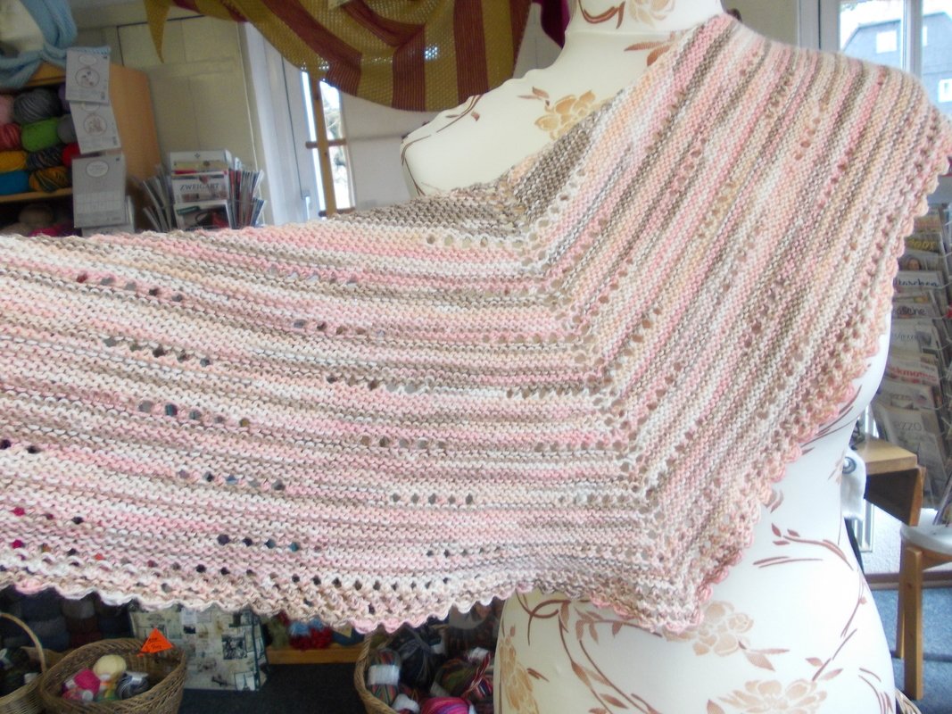Dieses Tuch habe ich aus nur 100 g 4fädiger Sockenwolle mit Seide gestrickt. Sockengarne mit Seide sind schön weich, haben einen sehr angenehmen Griff und eignen sich daher auch für Schals und Tücher. Es gibt sie in vielen schönen Farbkombinationen. Auch einfarbig ist dieses Tuch ein tolles Accessoir für den Übergang.