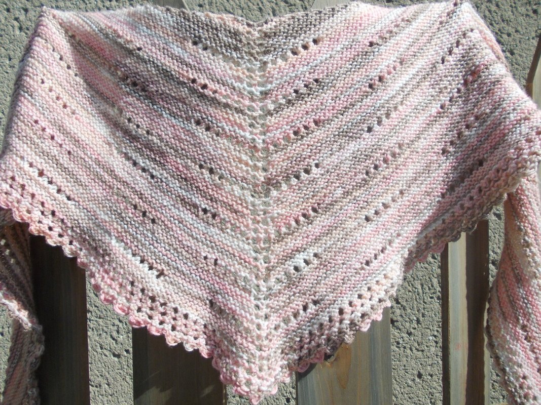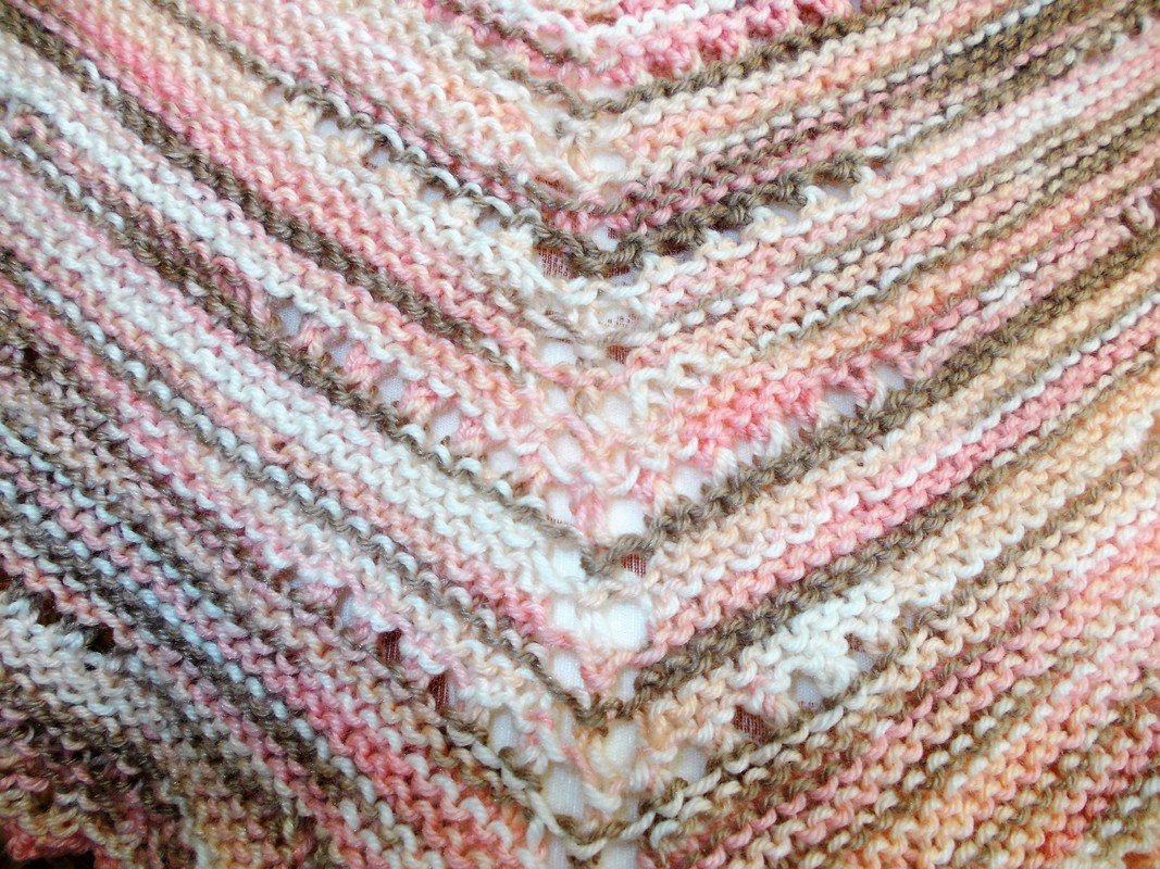 Ich habe mit 3 Maschen begonnen und gleichmäßig in der Mitte und an den Rändern zugenommen. Die Lochmustergruppen lockern das Kraus-Rechts-Gestrick auf und lassen sich gut merken. Mein fertiges Tuch ist ca. 165 cm breit und 32 cm tief.