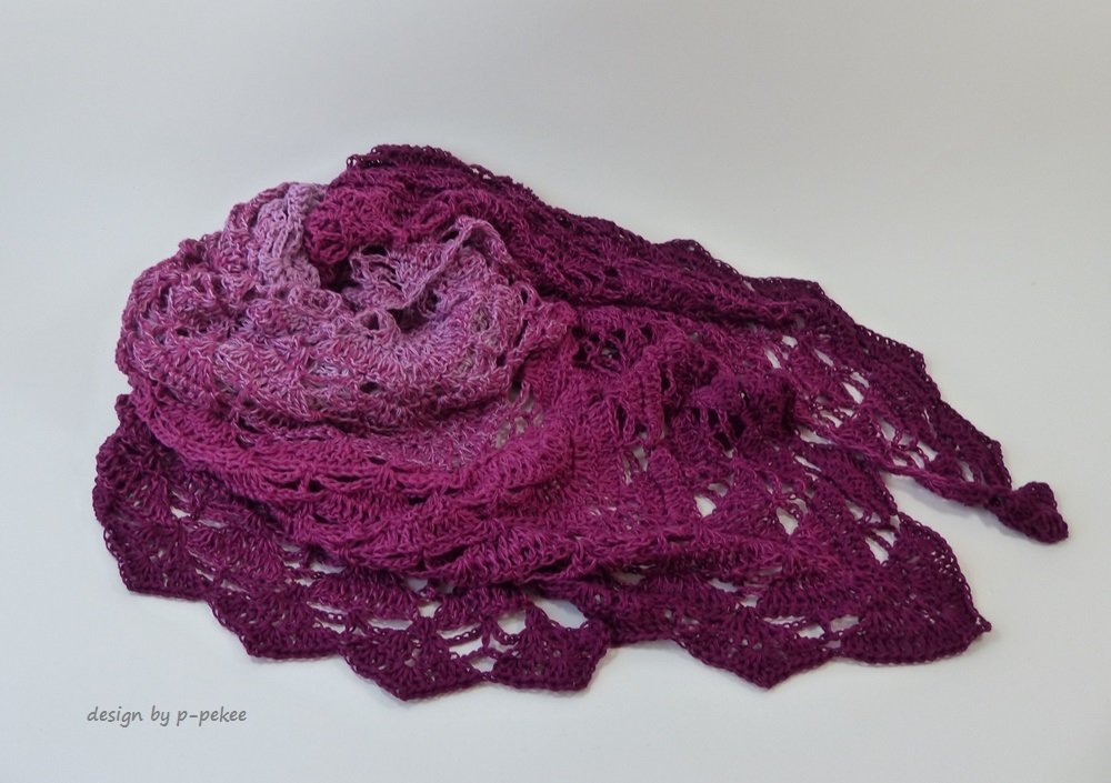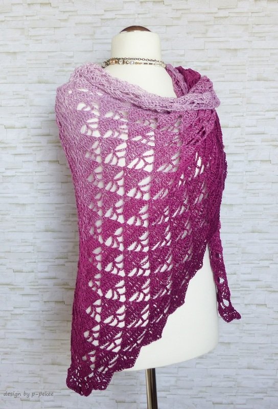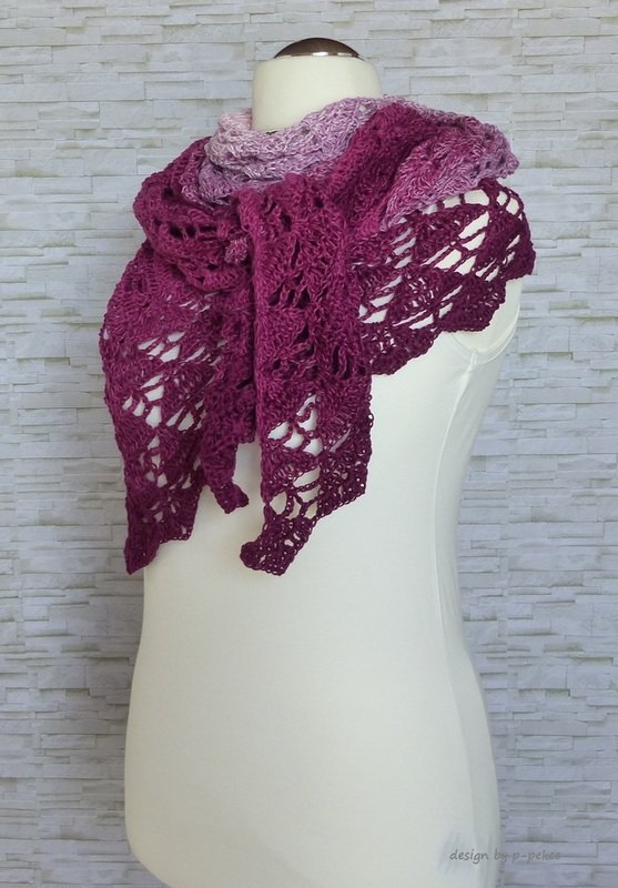 Das Dreieckstuch kann mit fasst jedem Garn (Nadelstärke 2,5 - 4) gehäkelt werden. Es eignet sich somit Farbverlaufsgarne (Bobbel), dünne Merino- oder Mikrofasergarne, Baumwoll- oder Baumwoll-Mischgarn. Für die abgebildeten Dreieckstücher sind Wollangaben in der Anleitung enthalten.