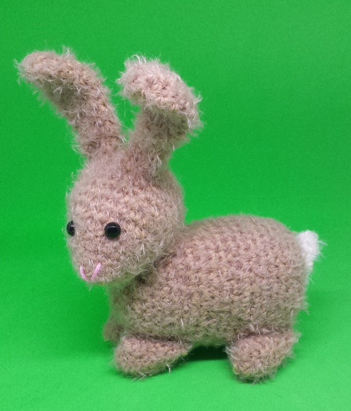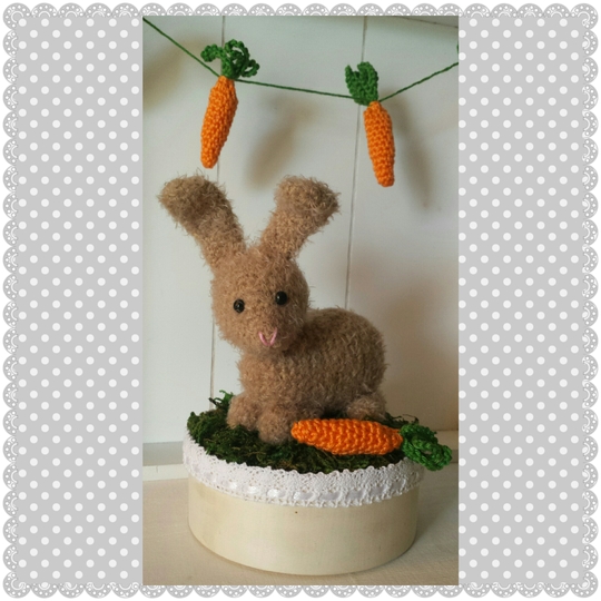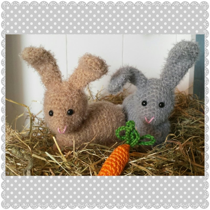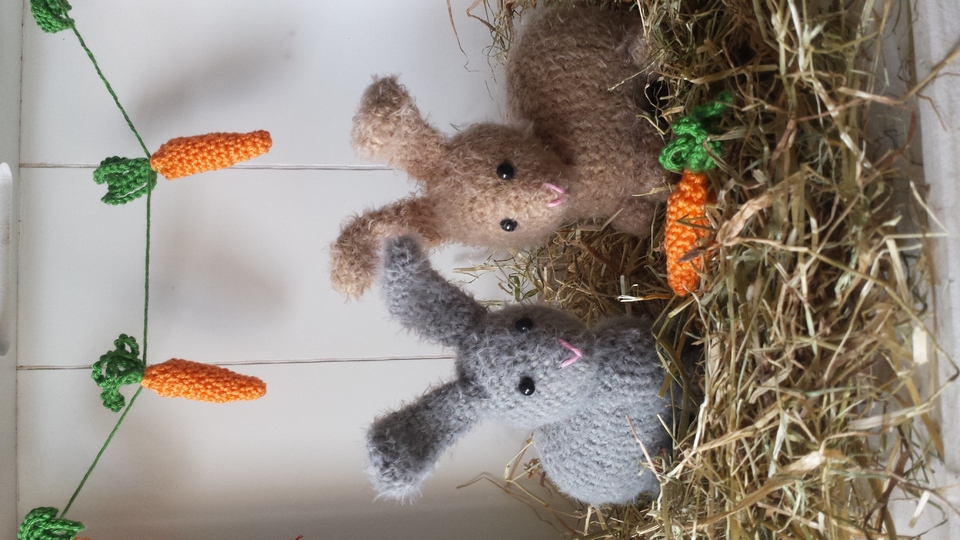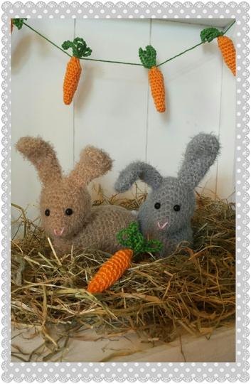 Durch ihre Größe Höhe ca.12 cm und Länge ca.10,5 cm ( mit dem vorgeschlagenen Garn)eignen sie sich wunderbar als Deko, als Beisitzer im Osternest, als kleines Mitbringsel zu Besuch, als kleine Freude für den Hasenliebhaber und noch für vieles mehr.