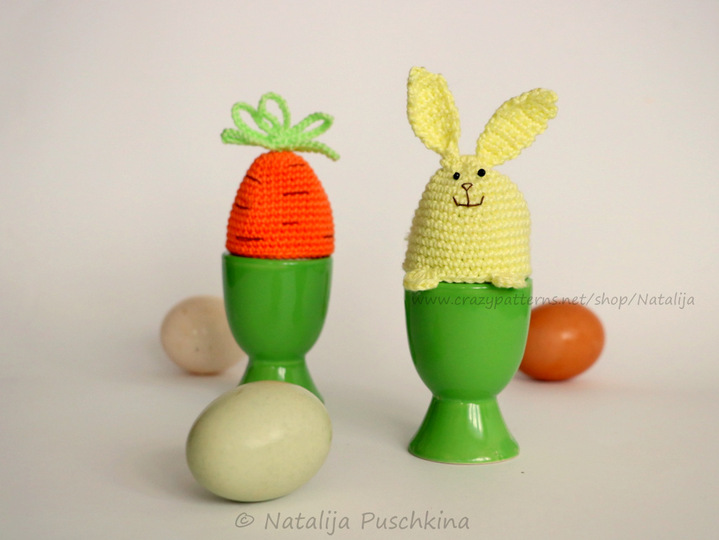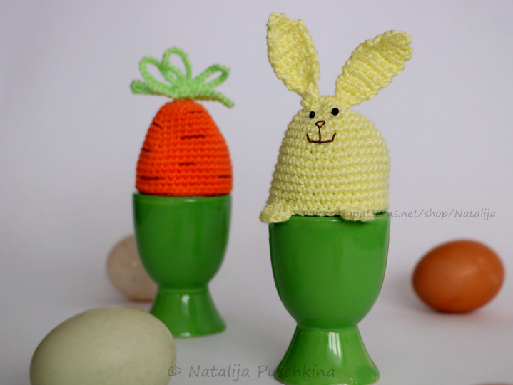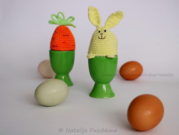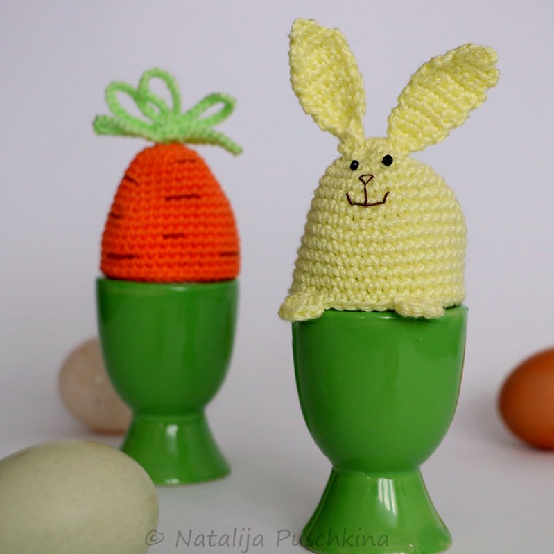Häkelanleitung für Eierwärmer Hasen und Möhren.