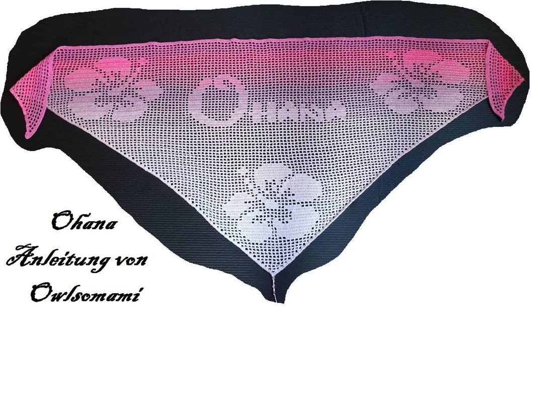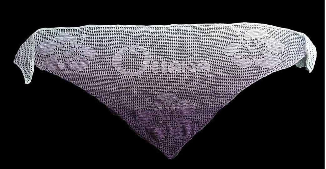 Das Tuch wurde mit Nadelstärke 3 und einem Bobble ca. 800 Meter LL und 3 fädrig gehäkelt. Es ist ca. 204 cm lang (linke zur rechte Ecke) und ca. 78 cm breit (Mitte bis zur Spitze) – die Größe ist aber abhängig von der Nadelstärke, der Festigkeit der einzelnen Maschen und dem verwendeten Garn.