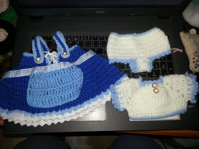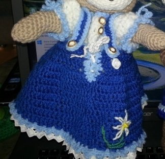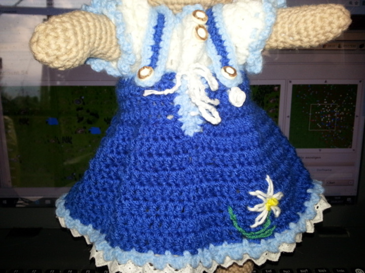 Dies ist eine Anleitung zum Erstellen von einem Trachtenkleid, Unterhose, Bluse und Blumenkranz für Puppen und Teddys von 30 bis 35 cm, sie kann natürlich jederzeit von erhöhen oder verringern der Luftmaschen geändert werden.