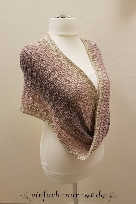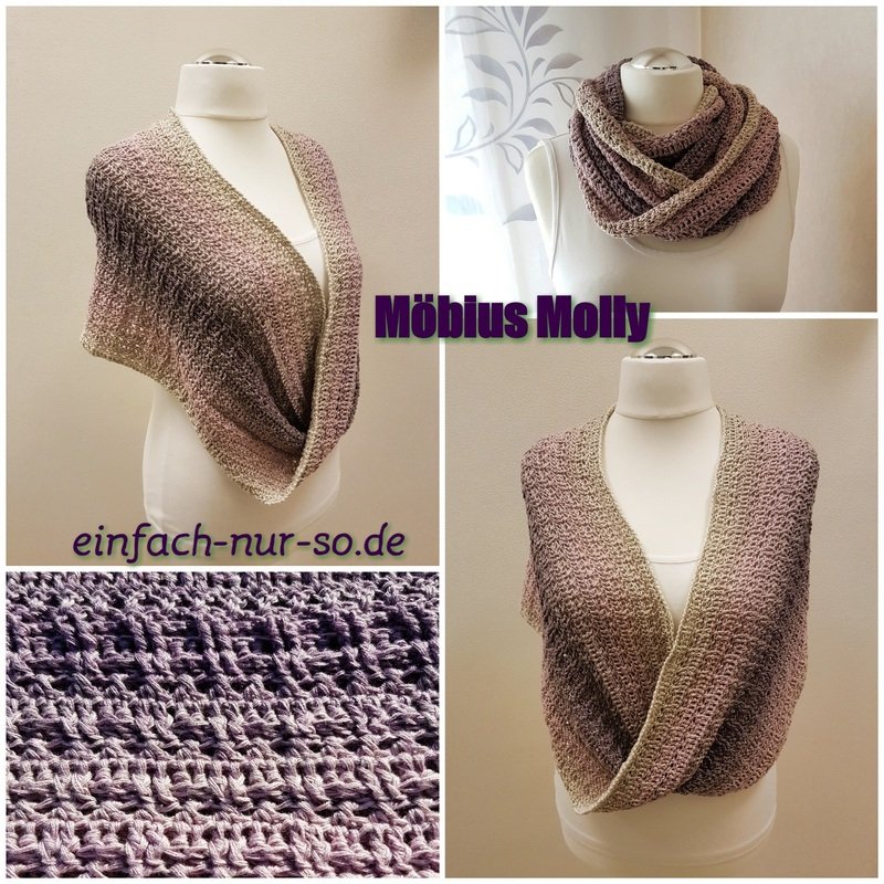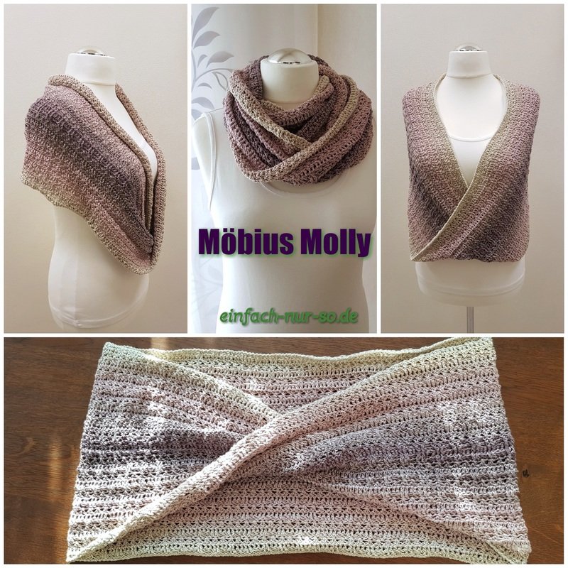 Der Möbius Molly auf den Fotos wurde mit ca. 900m 4fädigen Farbverlaufsgarn und einer
