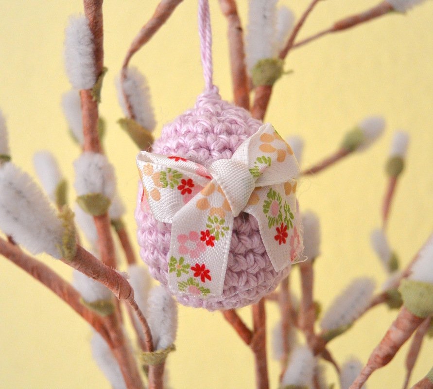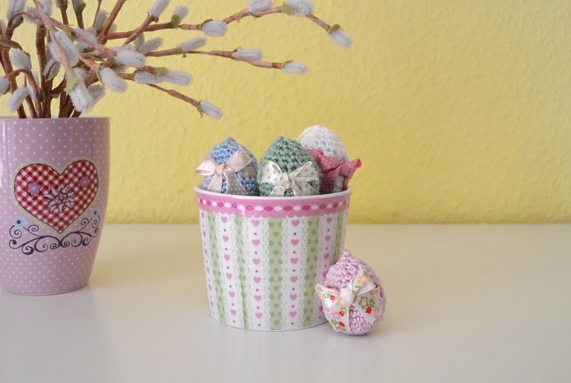 ... du möchtest noch schnell etwas für den Osterstrauch häkeln oder einen Anhänger für ein Ostergeschenk? Dann sind diese Eier perfekt. Ruckzuck aus Garnresten gehäkelt und mit Bandresten verziert...
