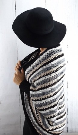 die Jacke besteht aus verschiedenen Mustern von KM, LM, feste M, Stb, halbe Stb, Doppelstäbchen, zusammen abgemaschte Maschen etc..