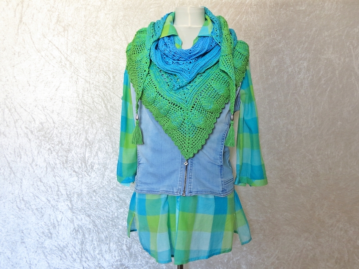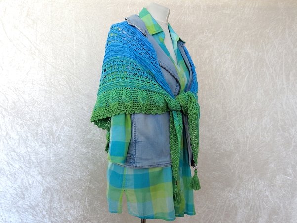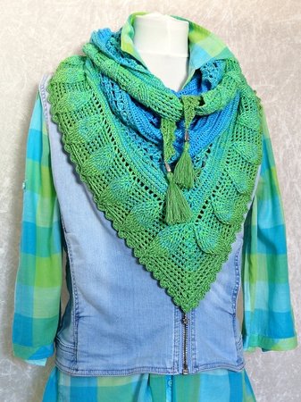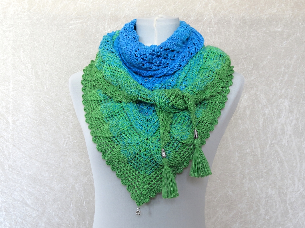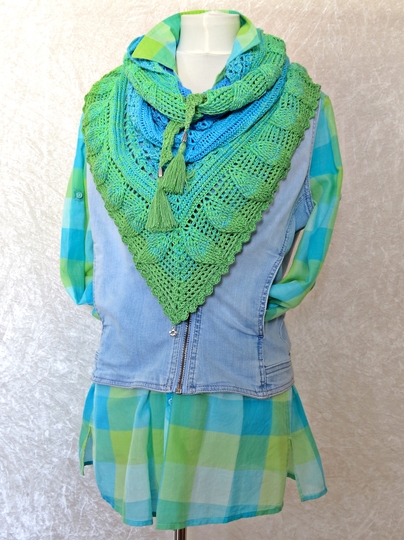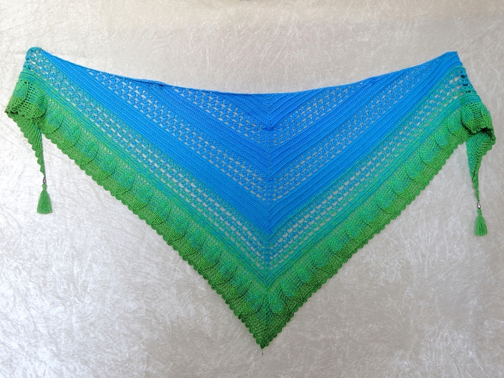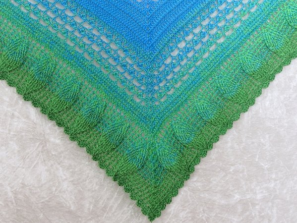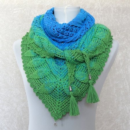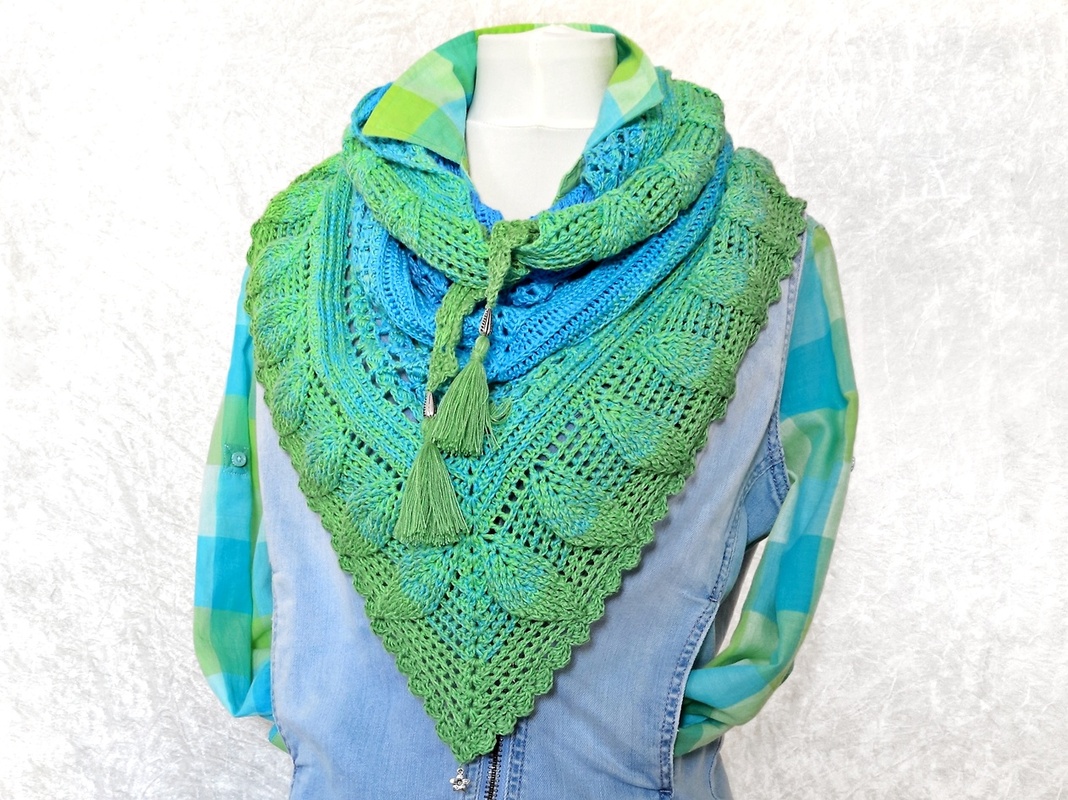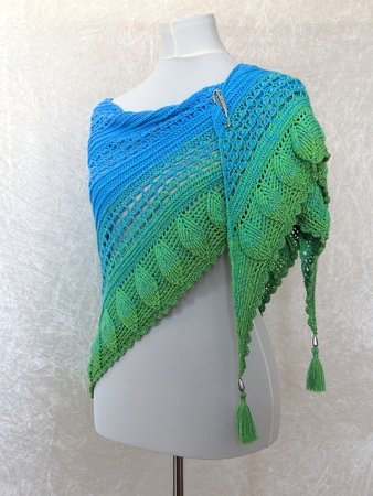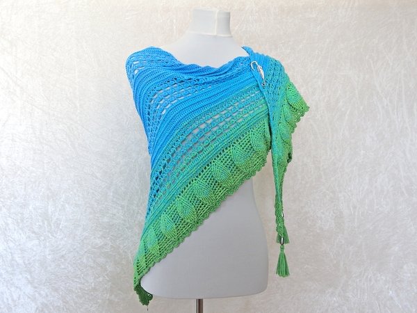 Blue Lagoon ist ein wunderschönes Dreieckstuch, das von oben nach unten gehäkelt wird.