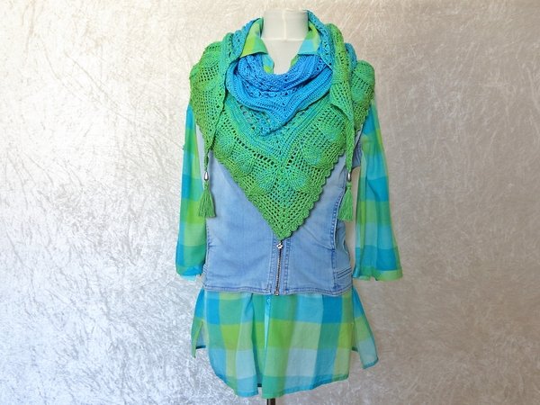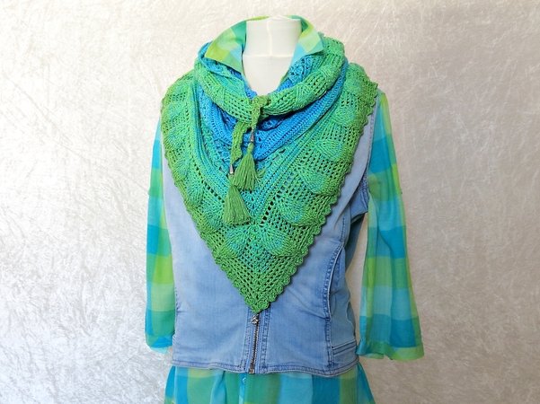 Besonders schön wirkt das Häkeltuch mit einer Farbverlaufswolle, kann aber auch in einem einfarbigen Garn gearbeitet werden.