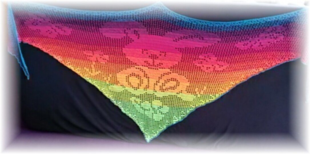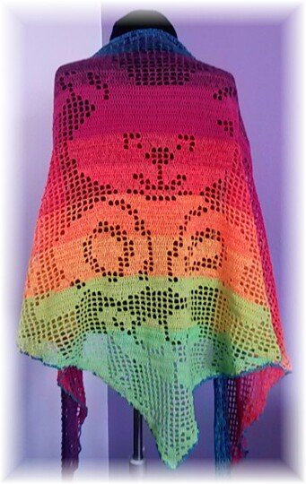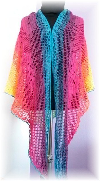 Das Tuch wurde mit 1200m, 3-fädigem Verlaufsgarn aus der Garnstube, mit Nadelstärke 2,5 gehäkelt.