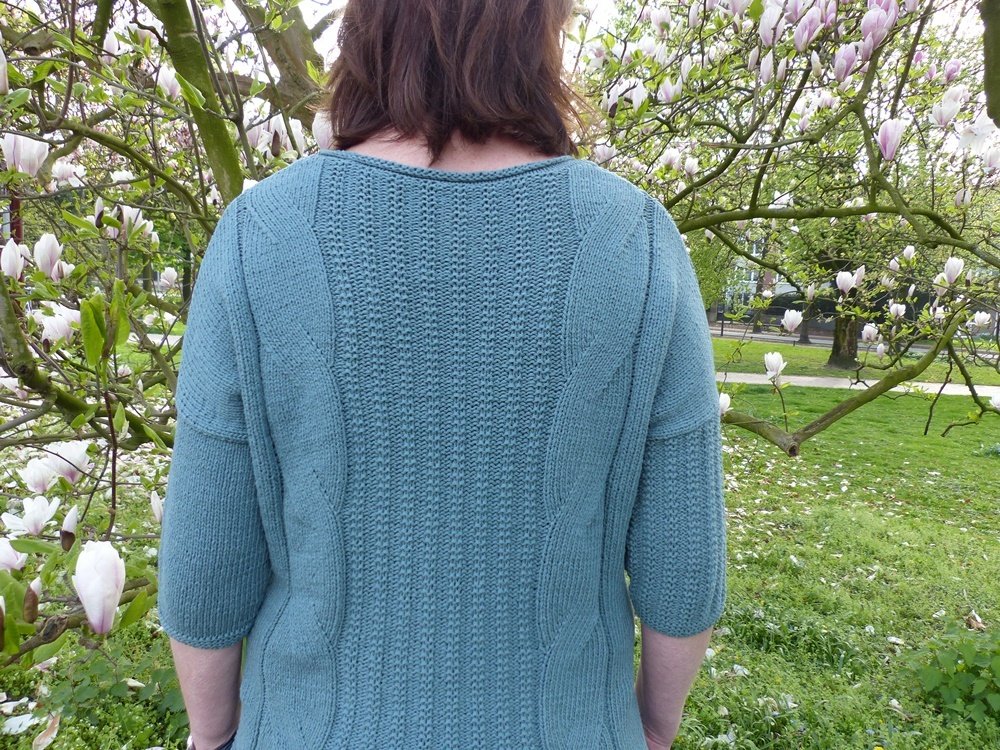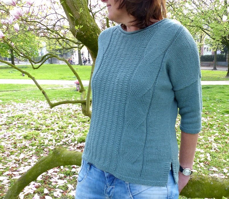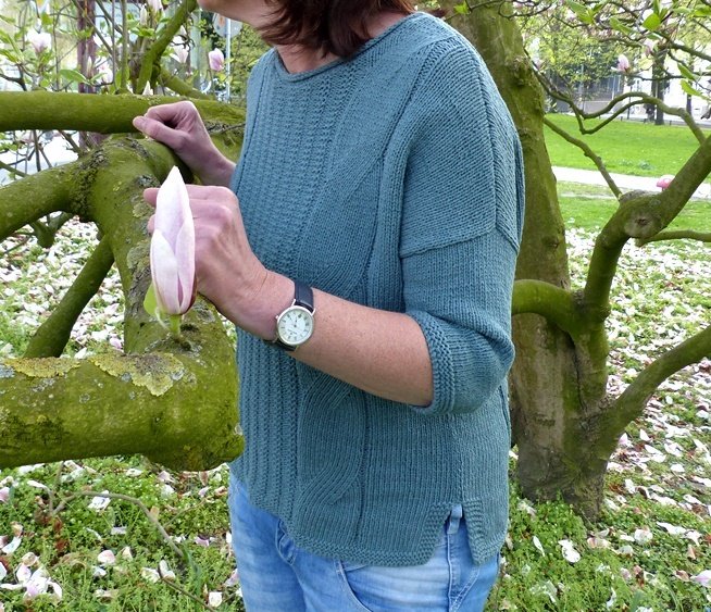 Der Pullover hat auf der Front- und auf der Rückseite zwei dynamische Zöpfe und ein schönes Einstrickmuster.