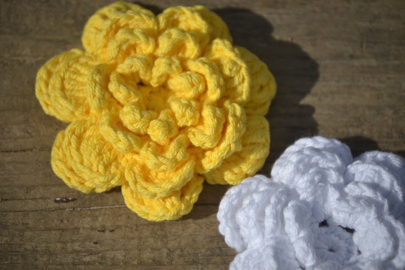 Passend zu der Mütze habe ich eine große Blume gearbeitet. Sie wird mit einer Klemme an der Seite der Mütze befestigt, so kannst du den Style nach Geschmack variieren und wechseln.