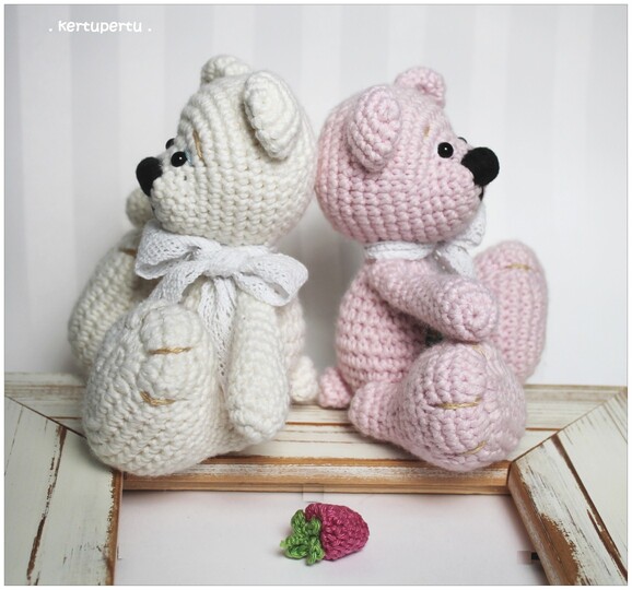 Handgemachter kleiner Himbeer Bär (rosa) und Himbeer Joghurt Bär (weiss) von Kertupertu (little teddy bear collection). Bezauberndes Spitzenband so wie Textil aus Baumwolle - diese Detaile machen die Bärchen unwiderstehlich niedlich. Du kannst auch andere Farben probieren - Dein Bär wird ein Schokoladenbär, Minze Bär, Blaubeer Bär...!