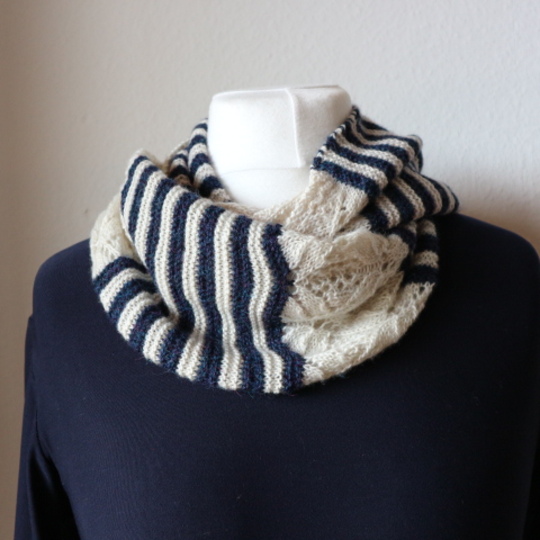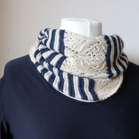 Farbe A: 1 Strang Madelinetosh Merino Light (creme) oder ein anderes Garn, dass in etwa die selbe Maschenprobe hat und Farbe B 2 Knäul Alpaca von Drops (dunkelblau).